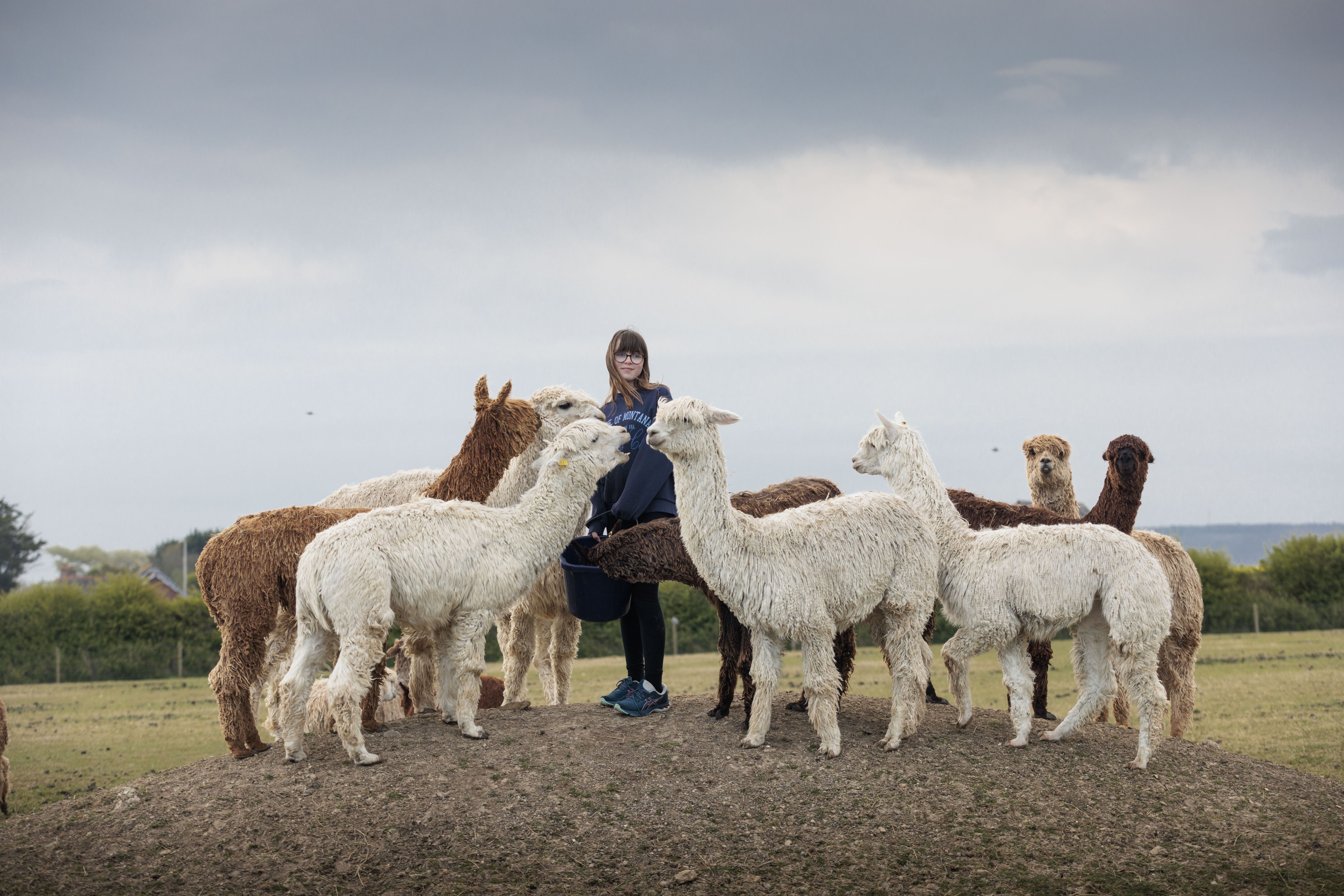 Rosie Payne, 12, feeds the alpacas and llamas at West Wight farm in Yarmouth, UK on April 20, 2025. (Photo by Vicki Couchman for the Times)