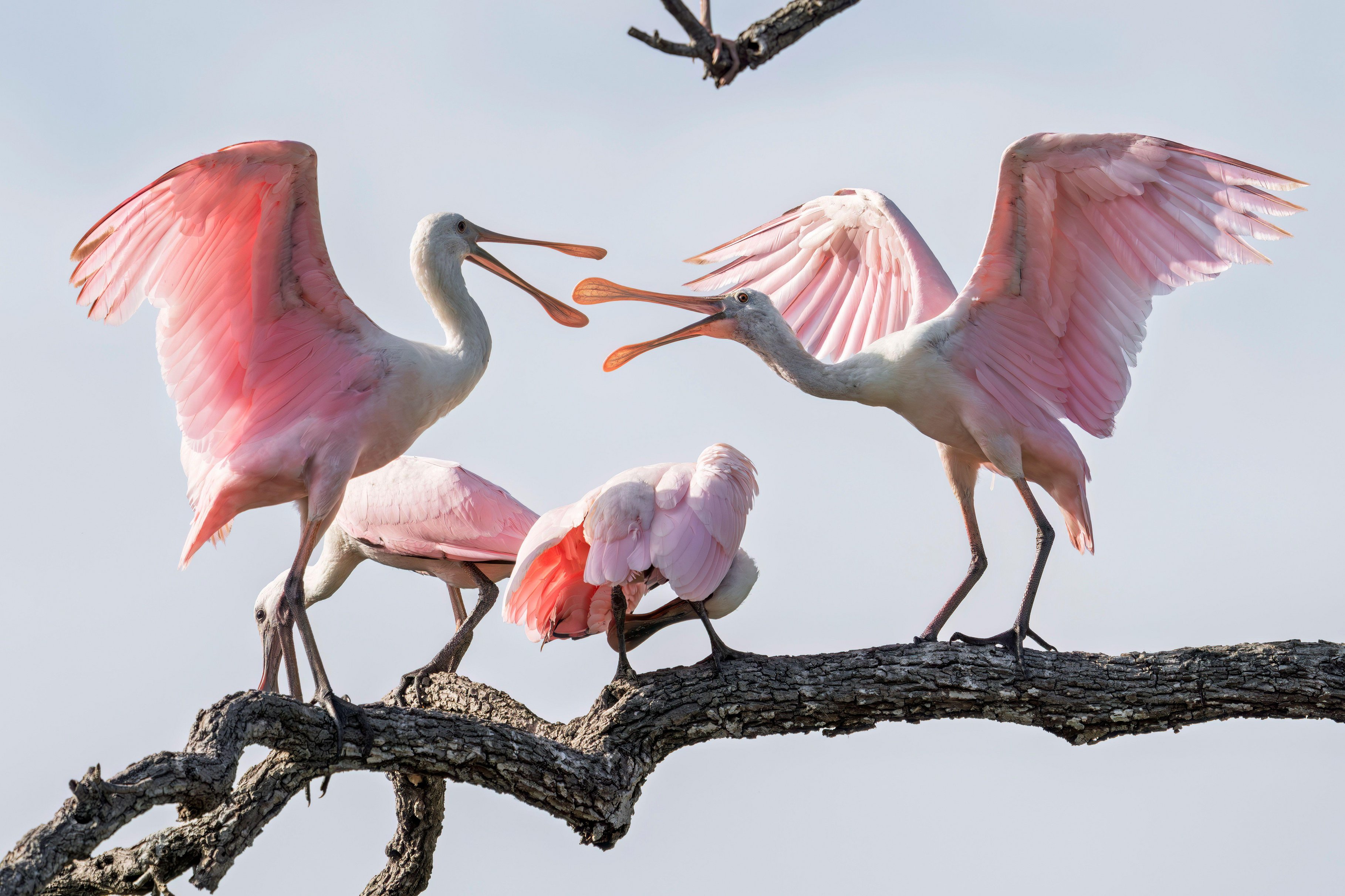 Two roseate spoonbills squabble at the St. Augustine Alligator Farm Zoological Park's bird rookery in Florida on April 24, 2025. (Photo by Ronen Tivony/ZUMA Press Wire/Alamy Live News)