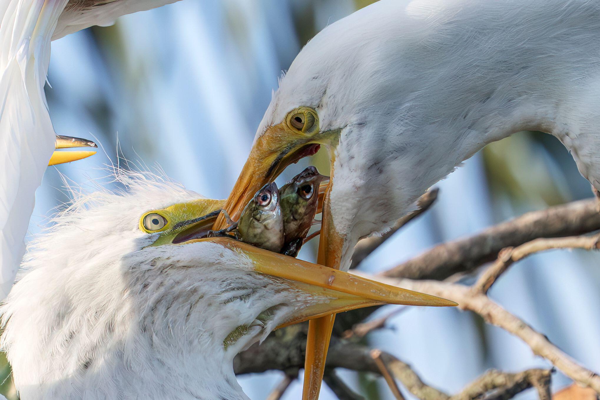 A great egret feeds her chick two silvery fish at the St. Augustine Alligator Farm Zoological Park's rookery in St. Augustine, Florida on April 24, 2025. This renowned rookery offers a sanctuary for wild wading birds and attracts wildlife photographers from around the world. (Photo by Ronen Tivony/ZUMA Press Wire/Alamy Live News)