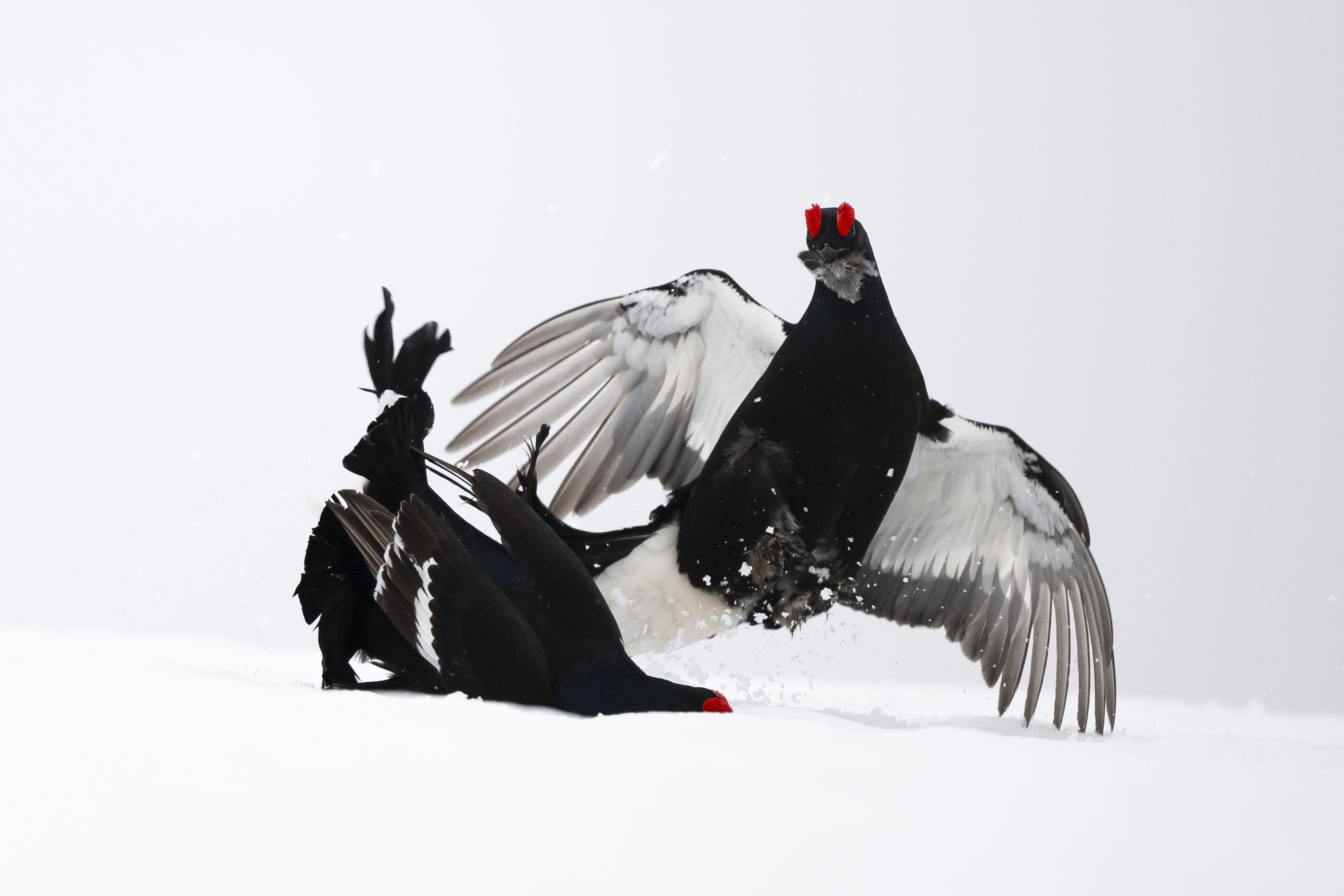 Two black grouse (Lyrurus tetrix) fight in freshly fallen snow during spring courtship in the Vaud Alps, Switzerland, 23 April 2025. From March to the end of May, black grouse gather in dance squares at the very edge of the forest. Roosters crow, parade, unfurl their plumage and compete for females. (Photo by Anthony Anex/EPA/EFE)