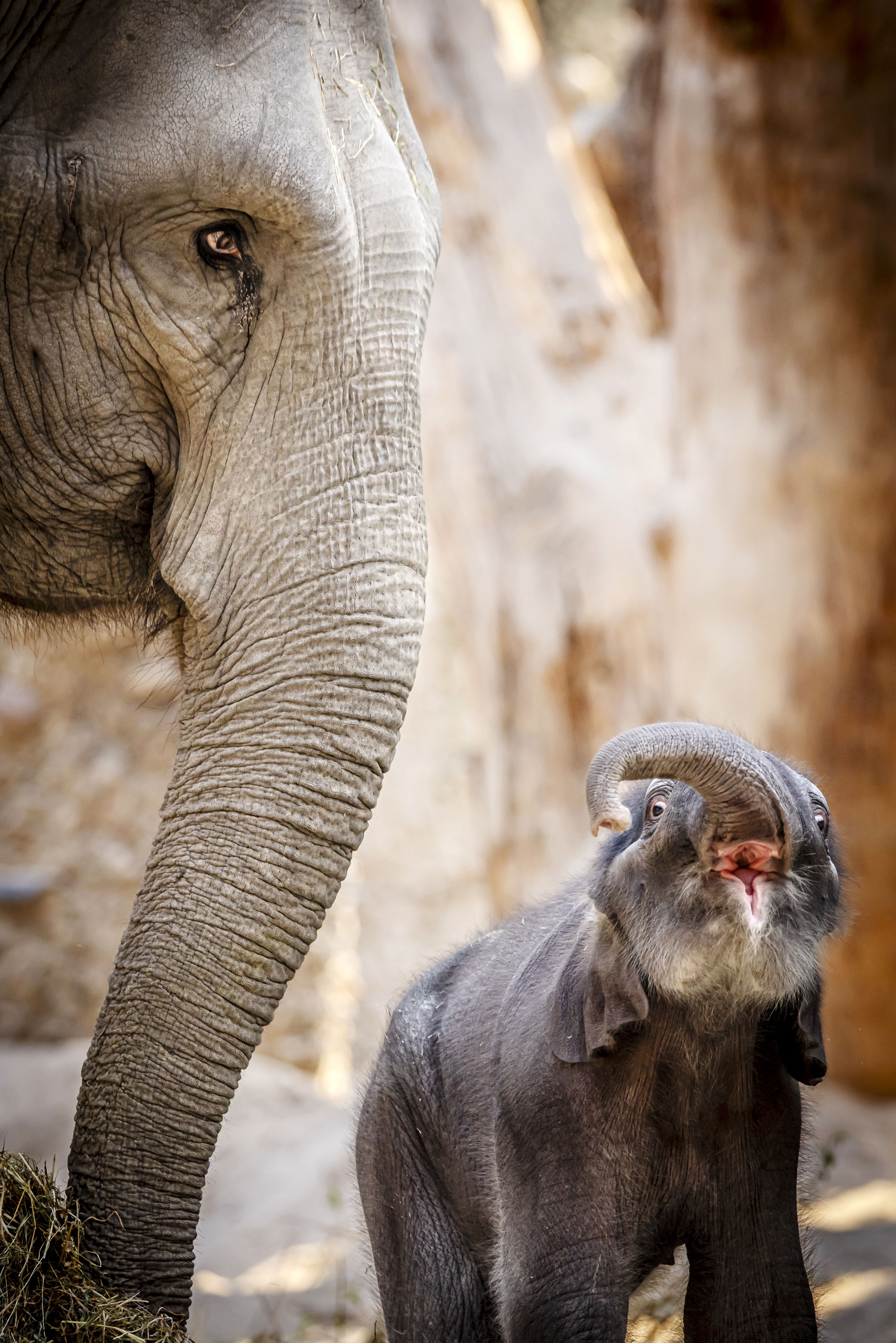 Elephant calf Zali plays with its trunk next to its mother at Zurich Zoo, in Zurich, Switzerland, 23 April 2025. Zali was born from the 19-year-old mother Farha on 19 April. The name Zali is inspired by a Hindu name and means 'instant appearance', explained the zoo director to the media. (Photo by Michael Buholzer/EPA)