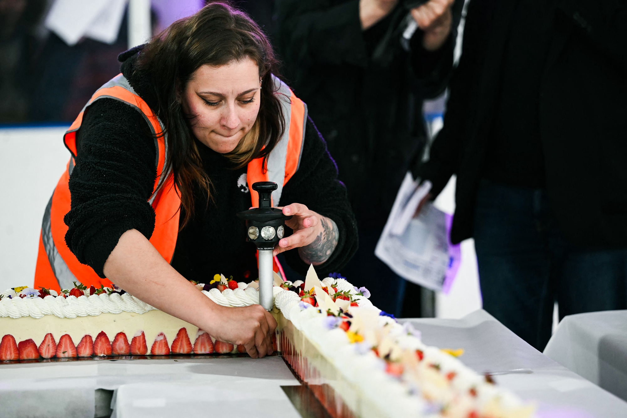 A Guinnessrecord official measures the height of the world's largest strawberry cake, 121,88m long, which traditionally must measure at least 8 cm in width and height, during a Guinness World Record event in Argenteuil, northern suburb of Paris, on April 23, 2025. Some 350 kilos of strawberries, 150 kilos of sugar, 415 kilos of creme patissiere and 4,000 eggs: on April 23, 2025, pastry chef and owner of pastry shop La Maison Heloise, Youssef El Gatou broke the record for the world's largest strawberry cake, with a cake certified to be 121.88 metres long. (Photo by Julie Sebadelha/AFP Photo)