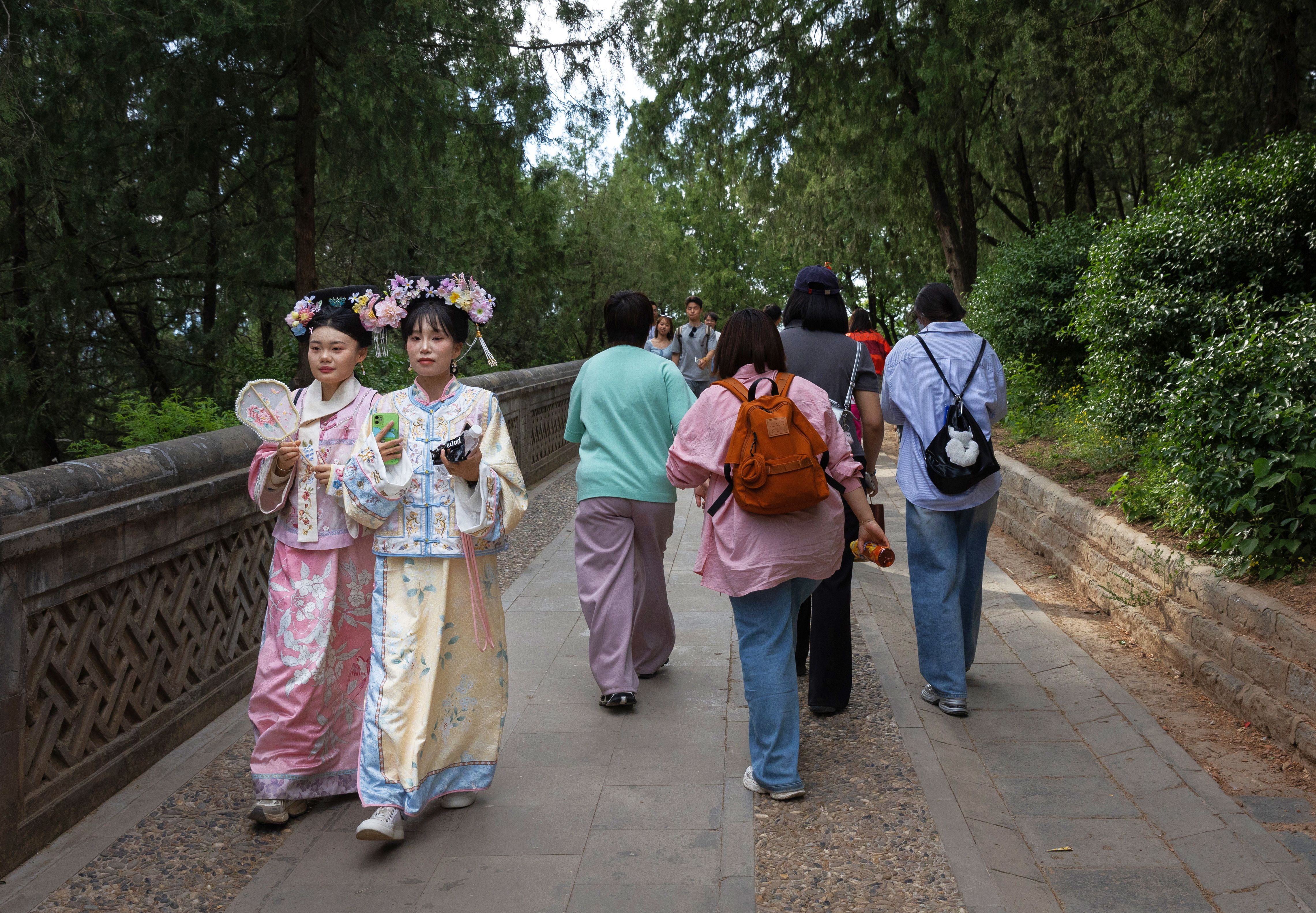 Tourists dressed in Hanfu visit the Summer Palace in Beijing, China, 01 May 2025. International Workers' Day is celebrated annually on 01 May, marking a public holiday in China. (Photo by Jessica Lee/EPA/EFE)