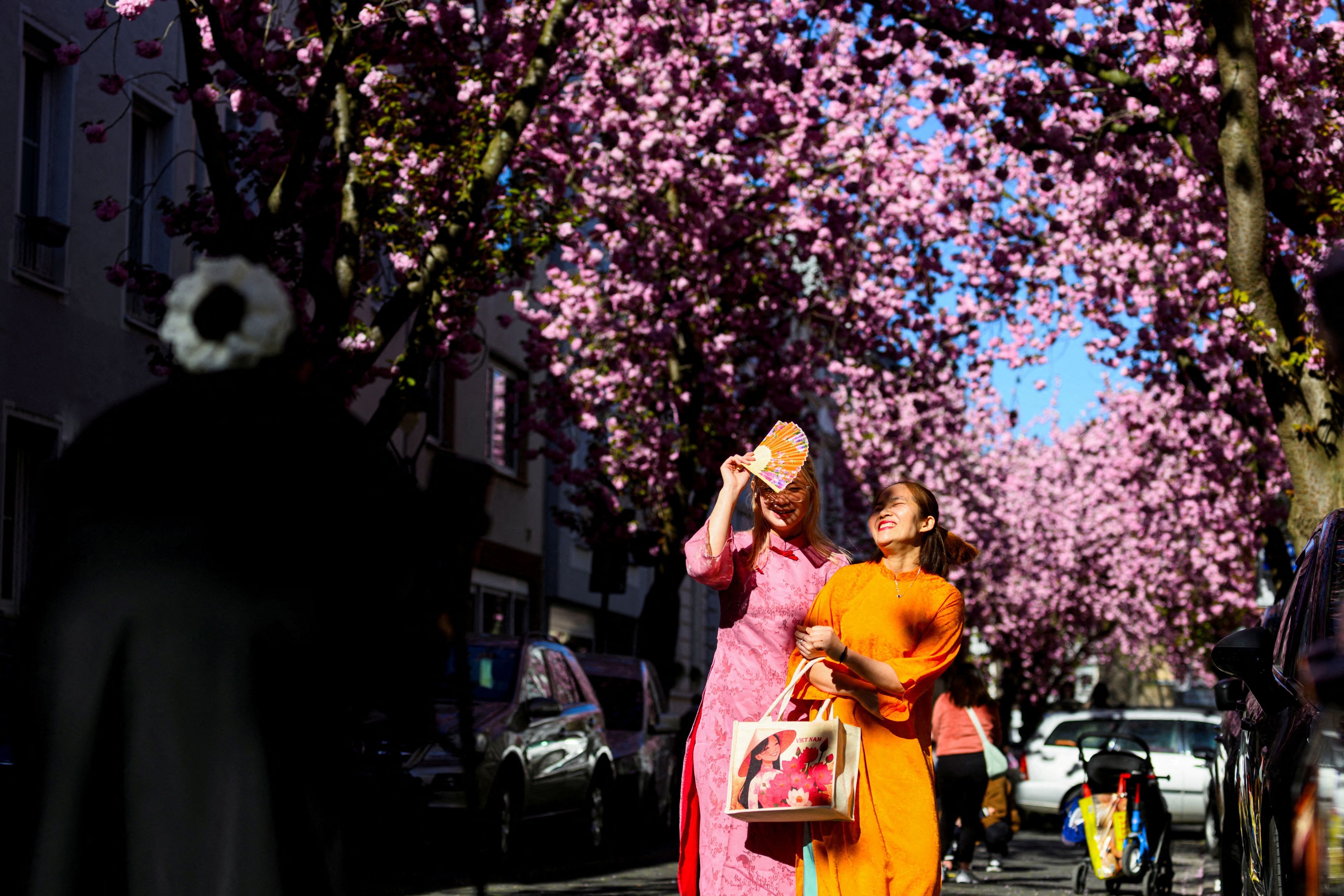 People take pictures near pink cherry blossom trees on Cherry Blossom Avenue in downtown Bonn, Germany. on April 7, 2025. (Photo by Jana Rodenbusch/Reuters)
