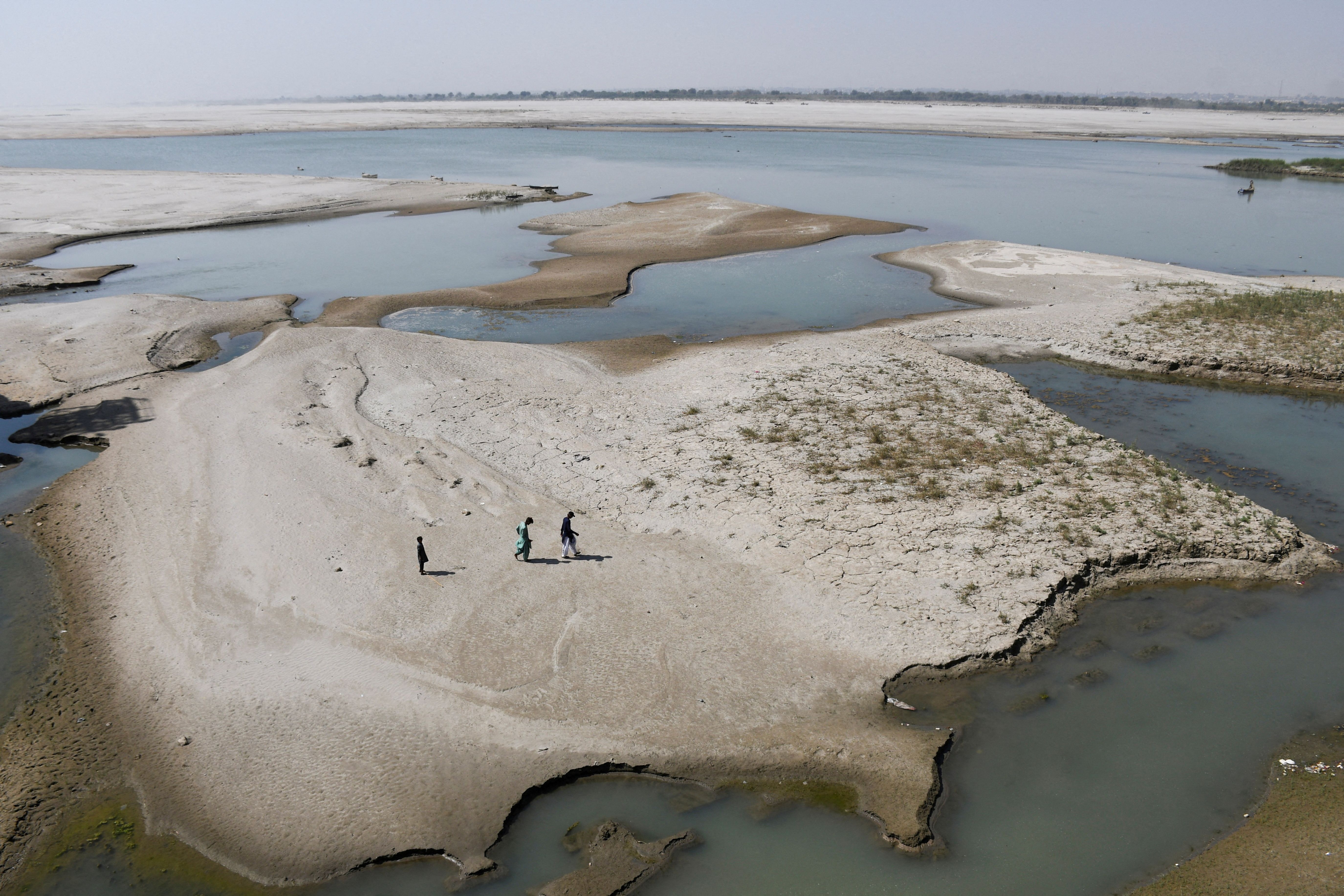 People walk on the dry patch of the Indus River, in Jamshoro, Pakistan on March 15, 2025. (Photo by Yasir Rajput/Reuters)