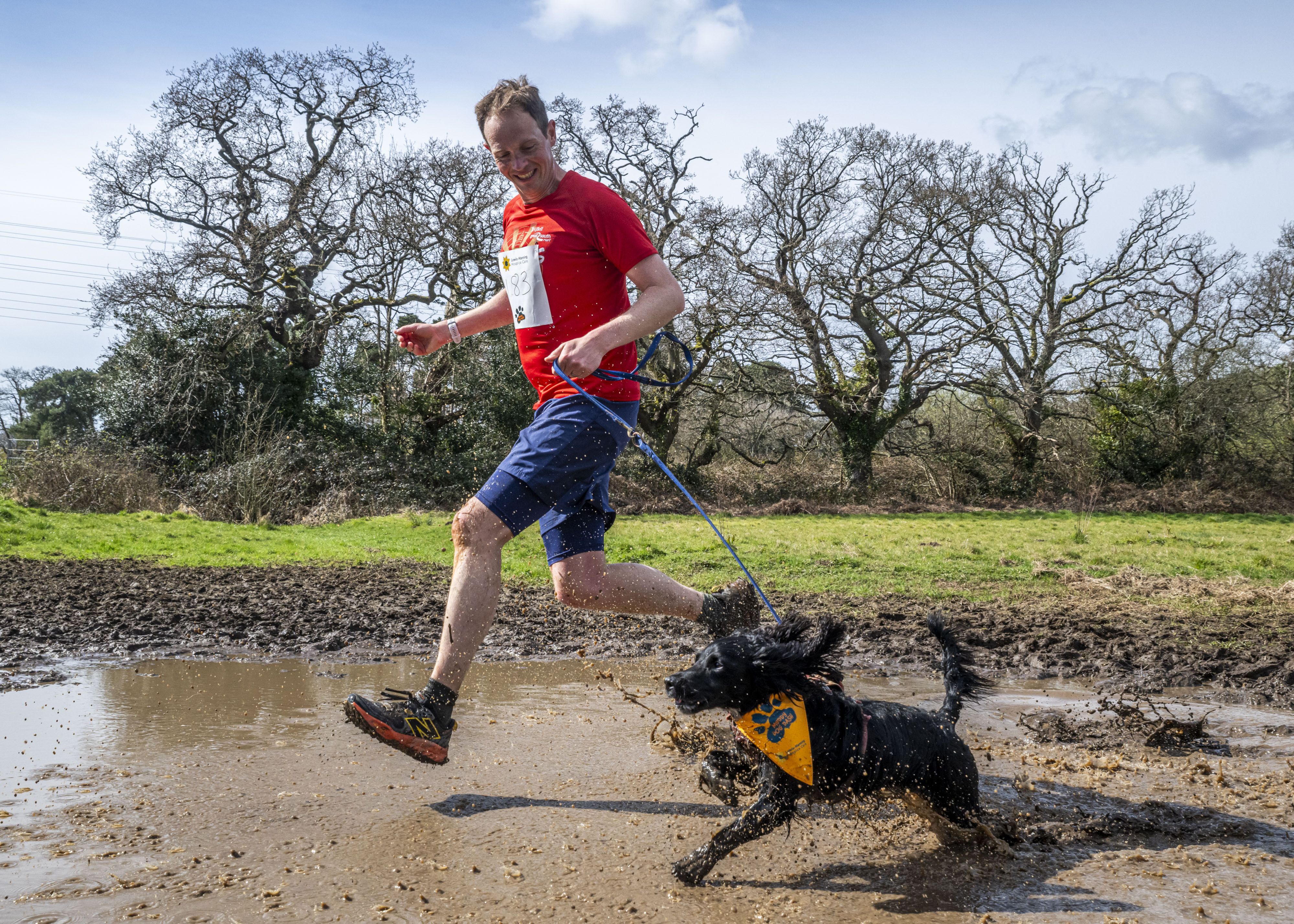 A dog and its owner getting stuck into the Muddy Dog Dash at Upton Country Park near Poole, UK on March 30, 2025, to raise money for Lewis-Manning Hospice Care. (Photo by MaxWillcock/Bournemouth News)