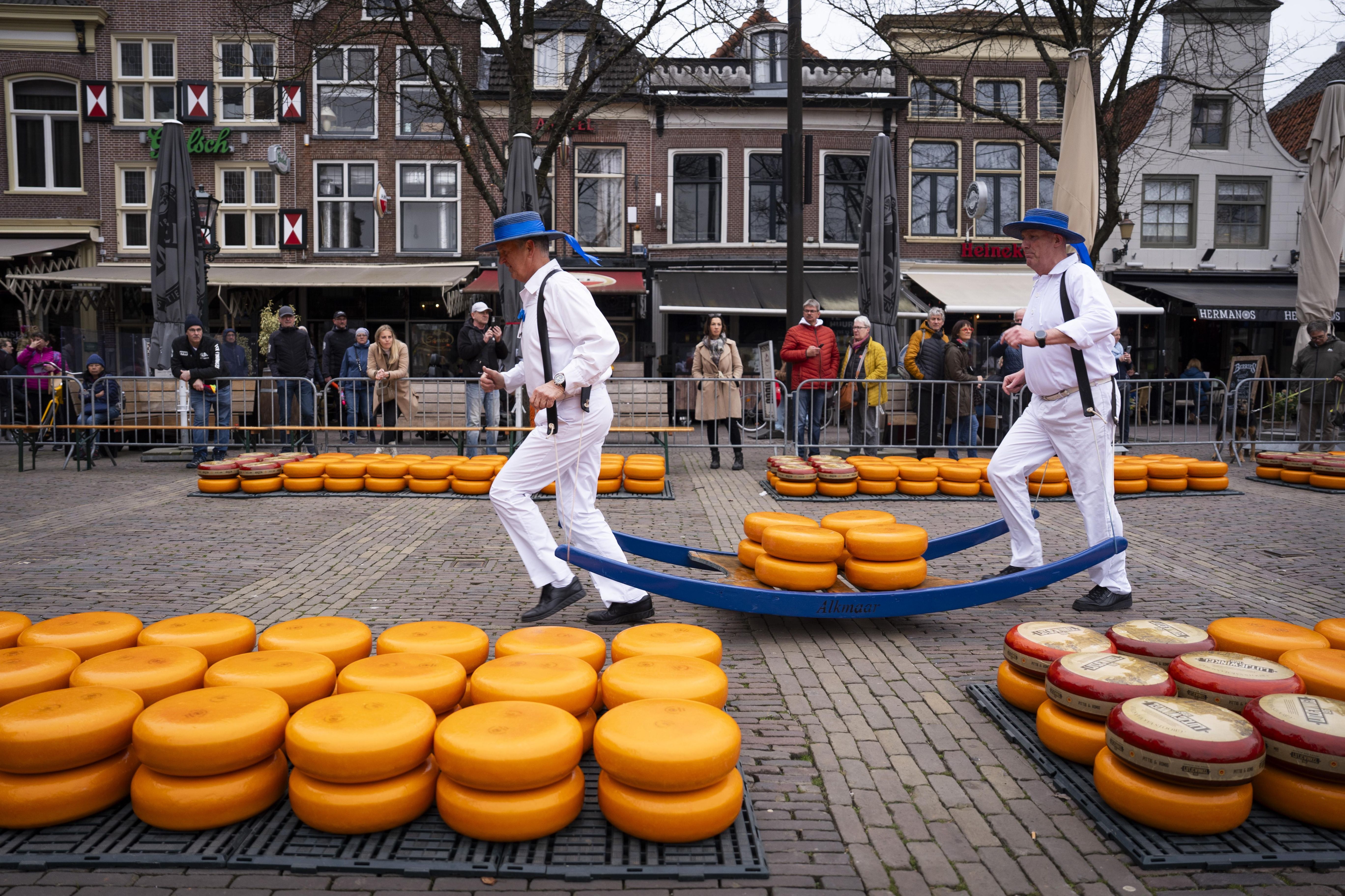Cheese carriers and traders display their products during the opening of the cheese market season at Waagplein in Alkmaar, the Nerherland, 28 March 2025. The cheese market in Alkmaar has existed since 1593 and is the oldest and largest in the Netherlands. More than 175,000 people visit the event annually. (Photo by Jeroen Jumelet/EPA/EFE)