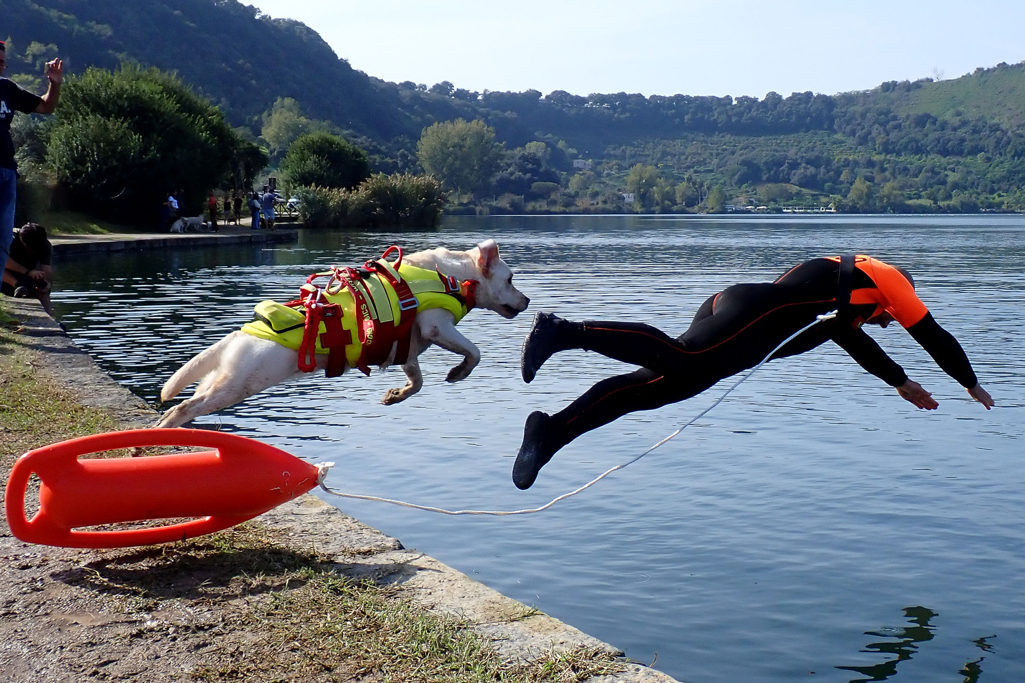 Volunteer of the SICS “Italian rescue dog school”, during a water rescue training session, inside the Averno lake in Pozzuoli. Italy, on October 26, 2024. (Photo by Vincenzo Izzo/Sipa USA)