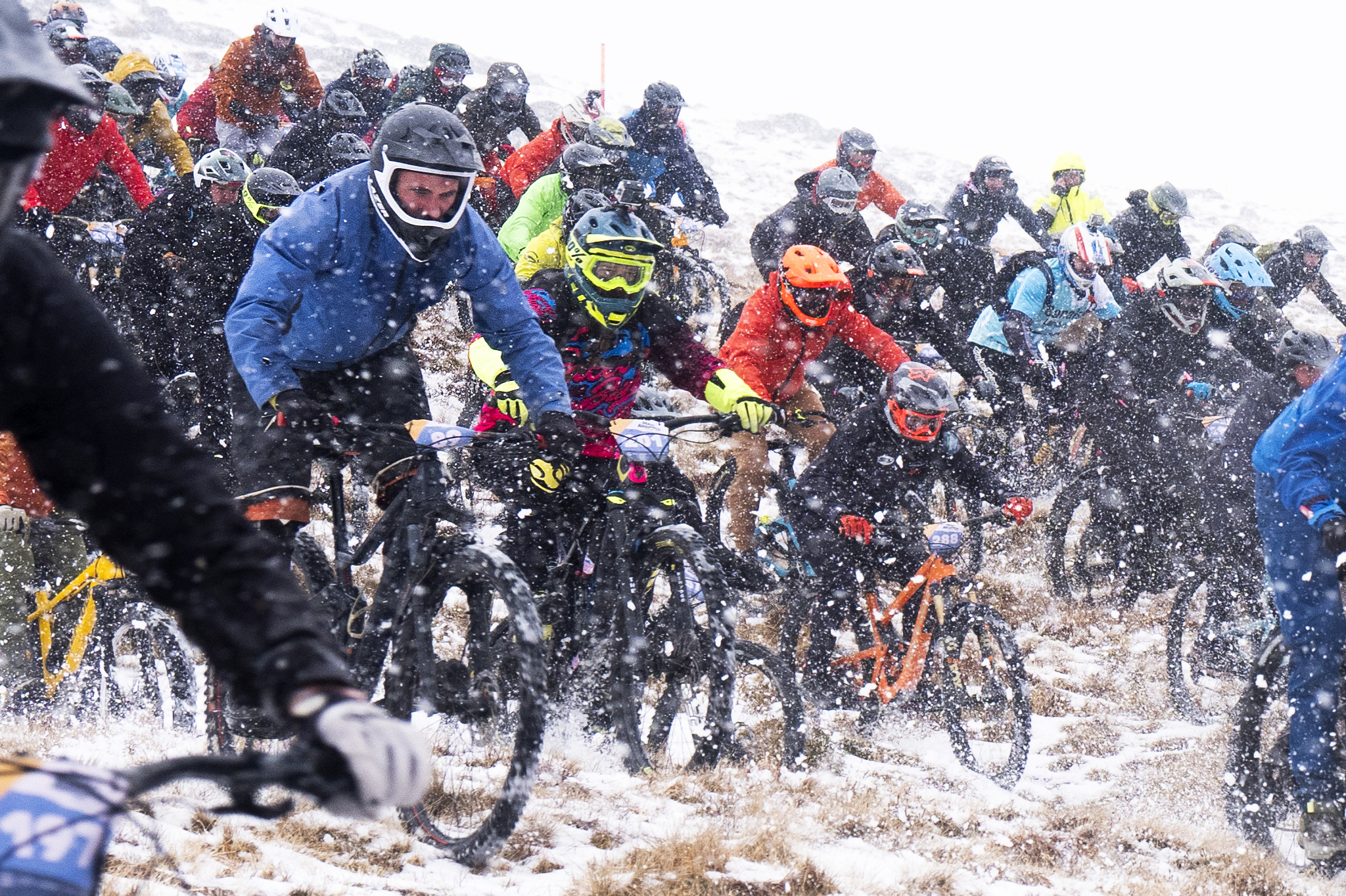Over 300 cyclists take part in MacAvalanche, a mass-start mountain bike race through the snow, descending over 900m from the summit of Aonach Mor in the Nevis Range near Fort William, UK on Saturday, March 29, 2025. (Photo by Jane Barlow/PA Wire)