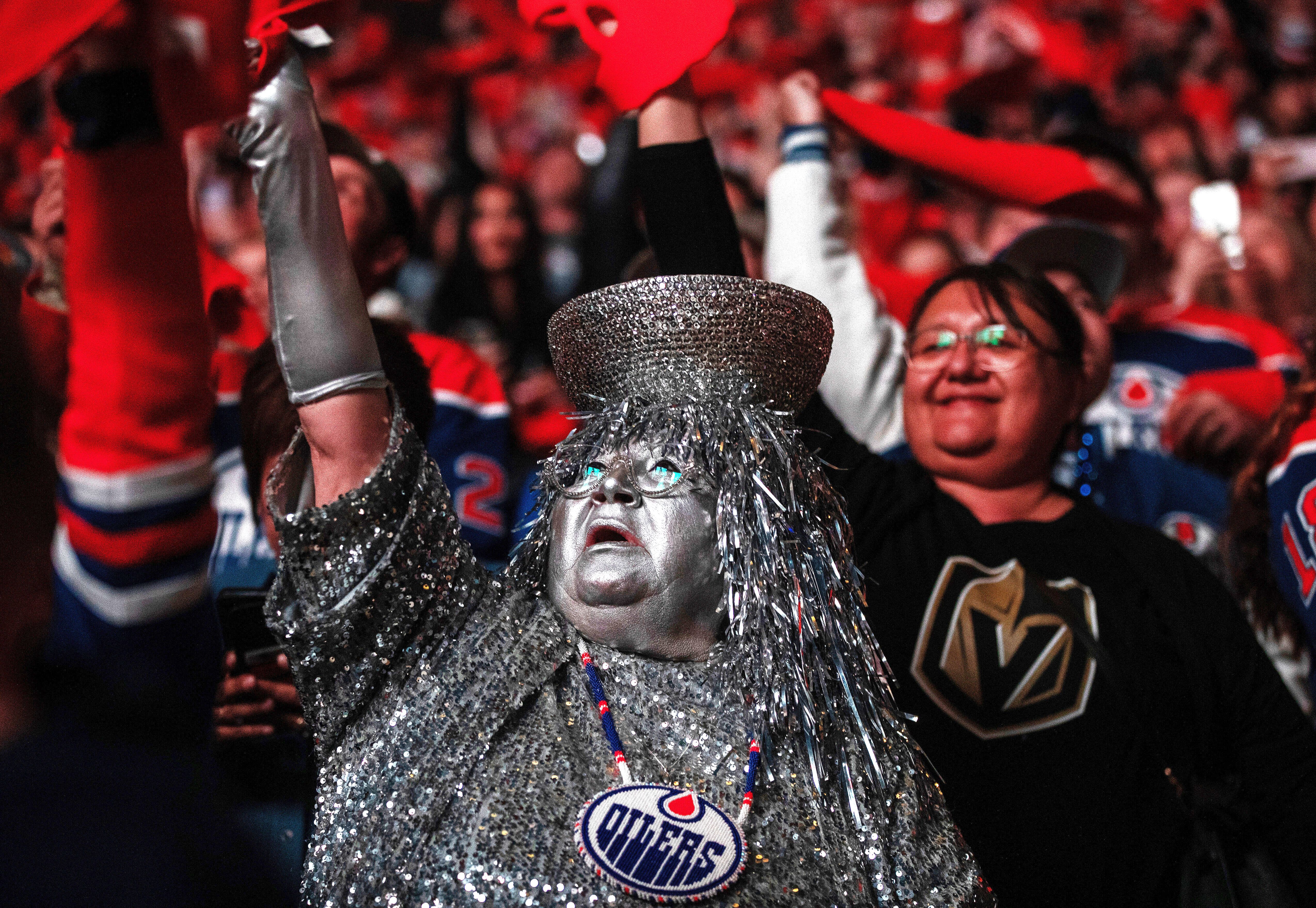 Fans cheer as the Los Angeles Kings and the Edmonton Oilers prepare for an NHL playoff hockey game in Edmonton, Alberta, Sunday, April 27, 2025. (Photo by Jason Franson/The Canadian Press via AP Photo)