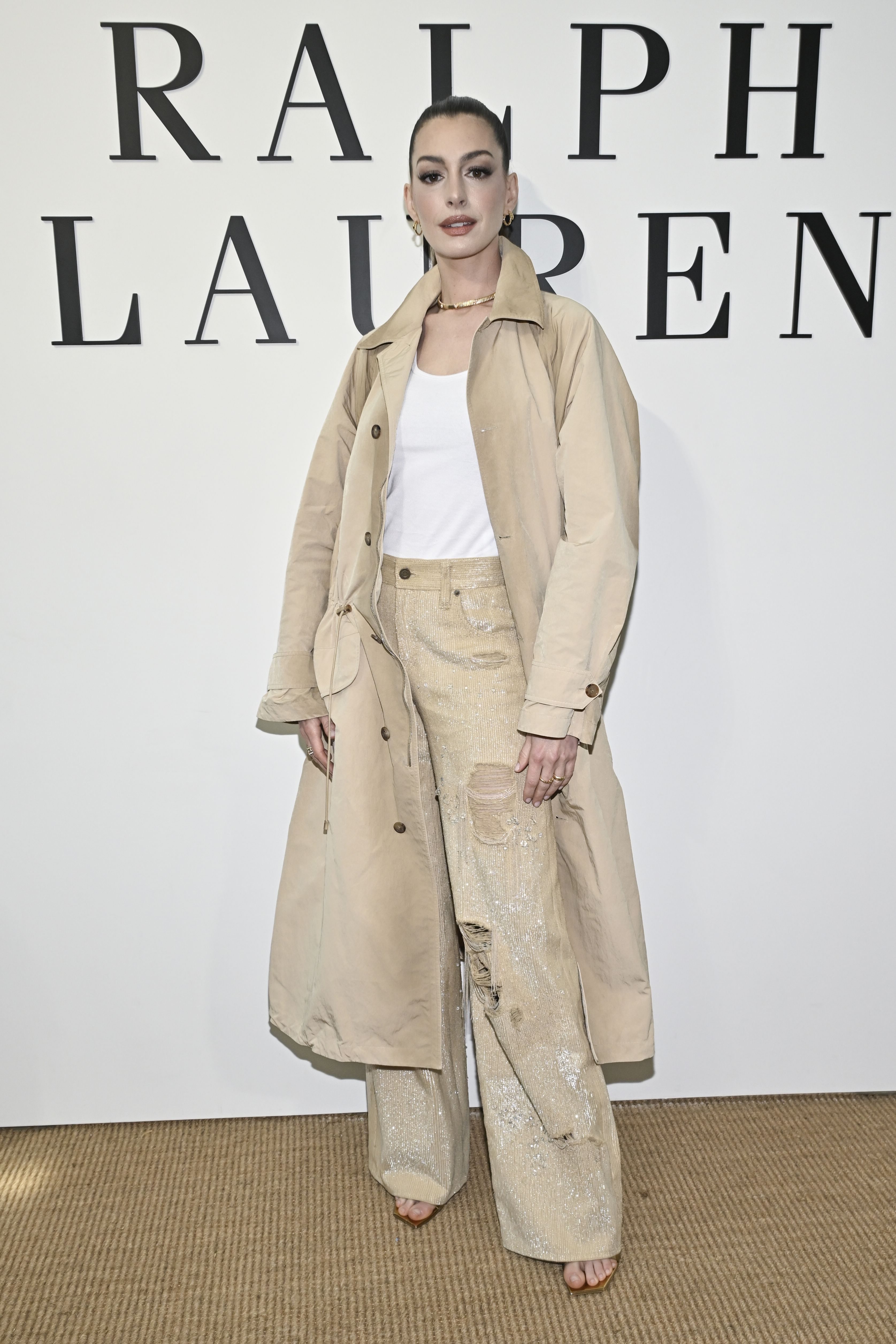 American actress Anne Hathaway arrives at the Ralph Lauren Fall 2025 presentation on Thursday, April 17, 2025, in New York. (Photo by Evan Agostini/Invision/AP Photo)