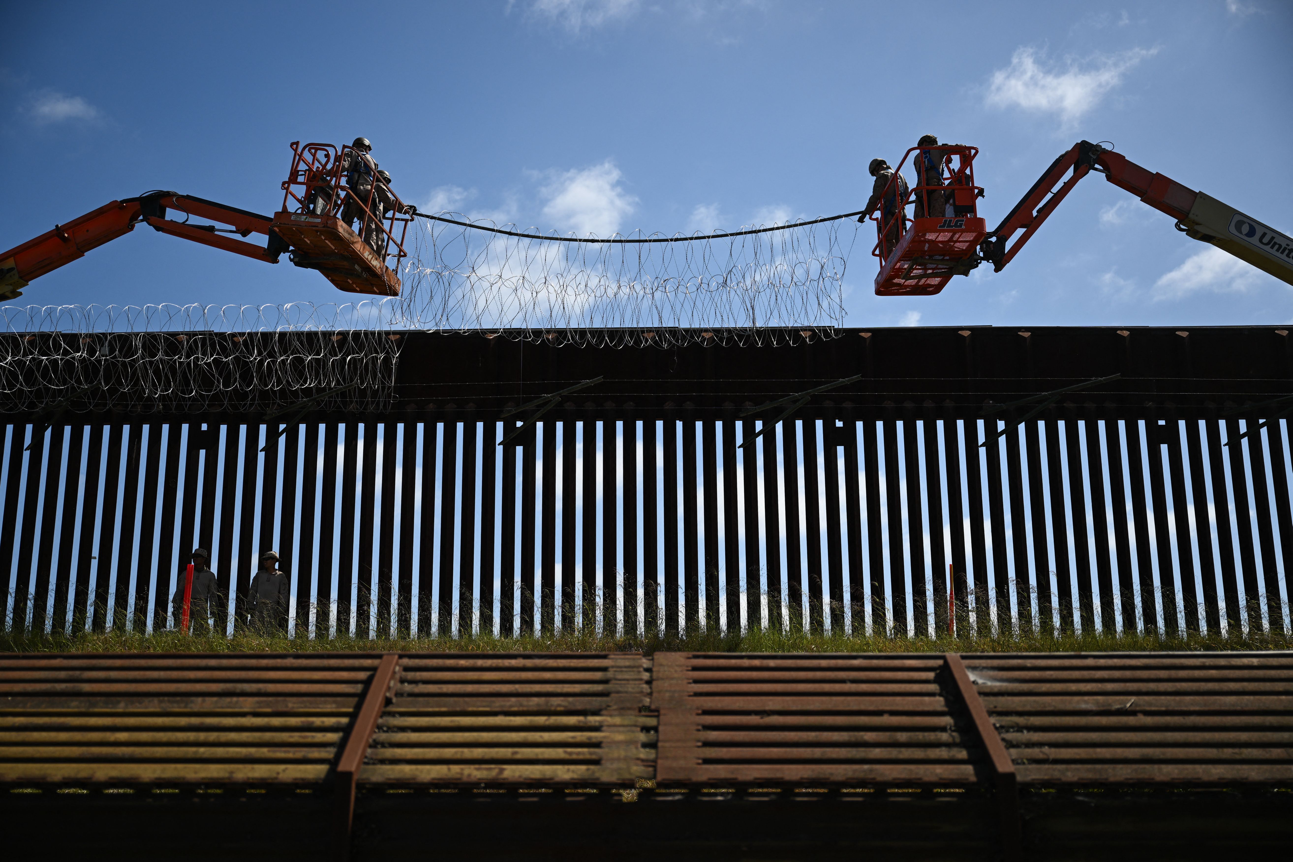 US military personnel install concertina wire on top of the wall along the US-Mexico border between San Diego and Tijuana near the San Ysidro Port of Entry in San Diego, California on April 23, 2025. (Photo by Patrick T. Fallon/AFP Photo)