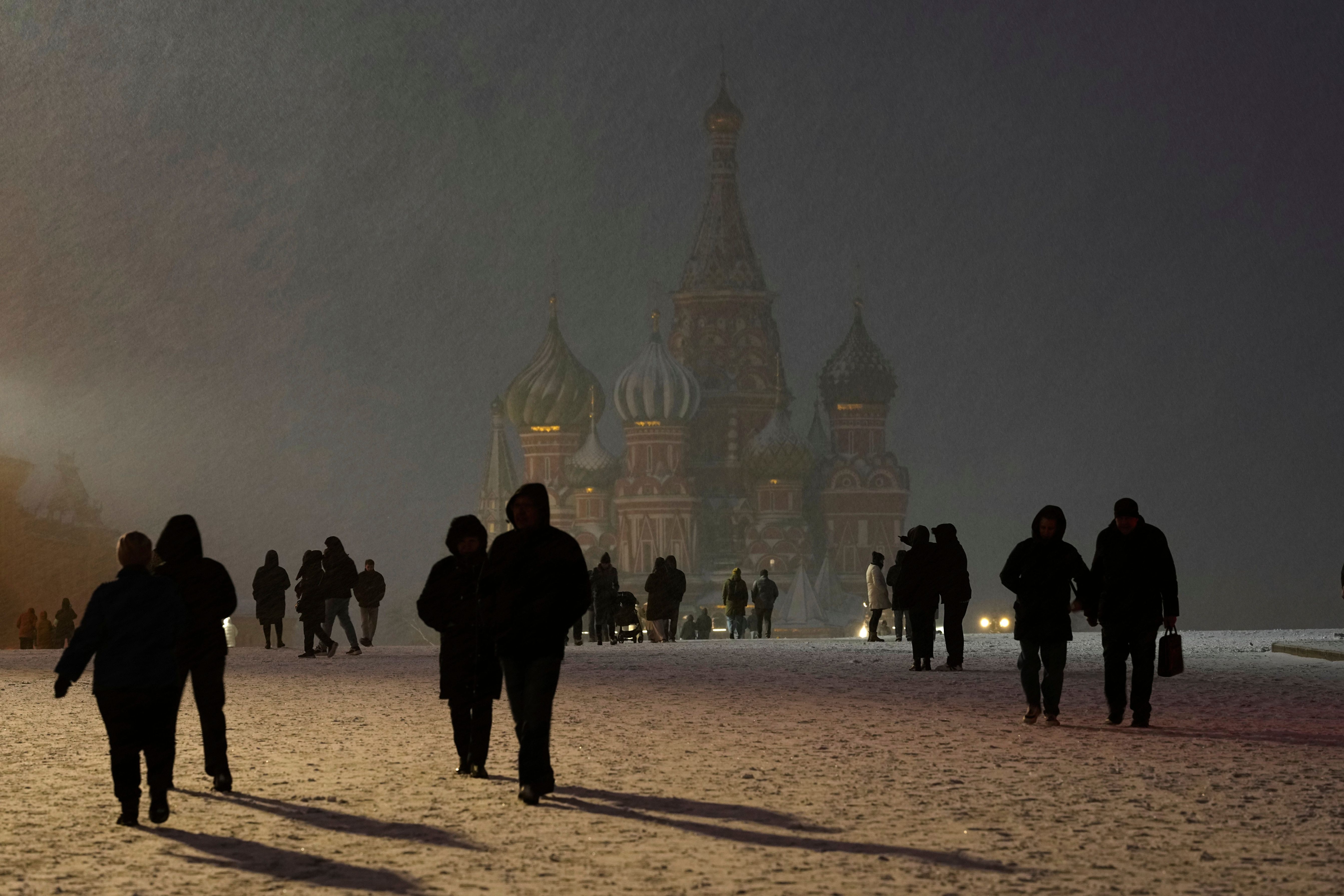 People walk in a snowy Red Square with the St. Basil's Cathedral, background center, during snowfall in Moscow, Russia, Tuesday, April 8, 2025, at temperatures around –1 degrees Celsius (30,2 Fahrenheit). (Photo by Alexander Zemlianichenko/AP Photo)