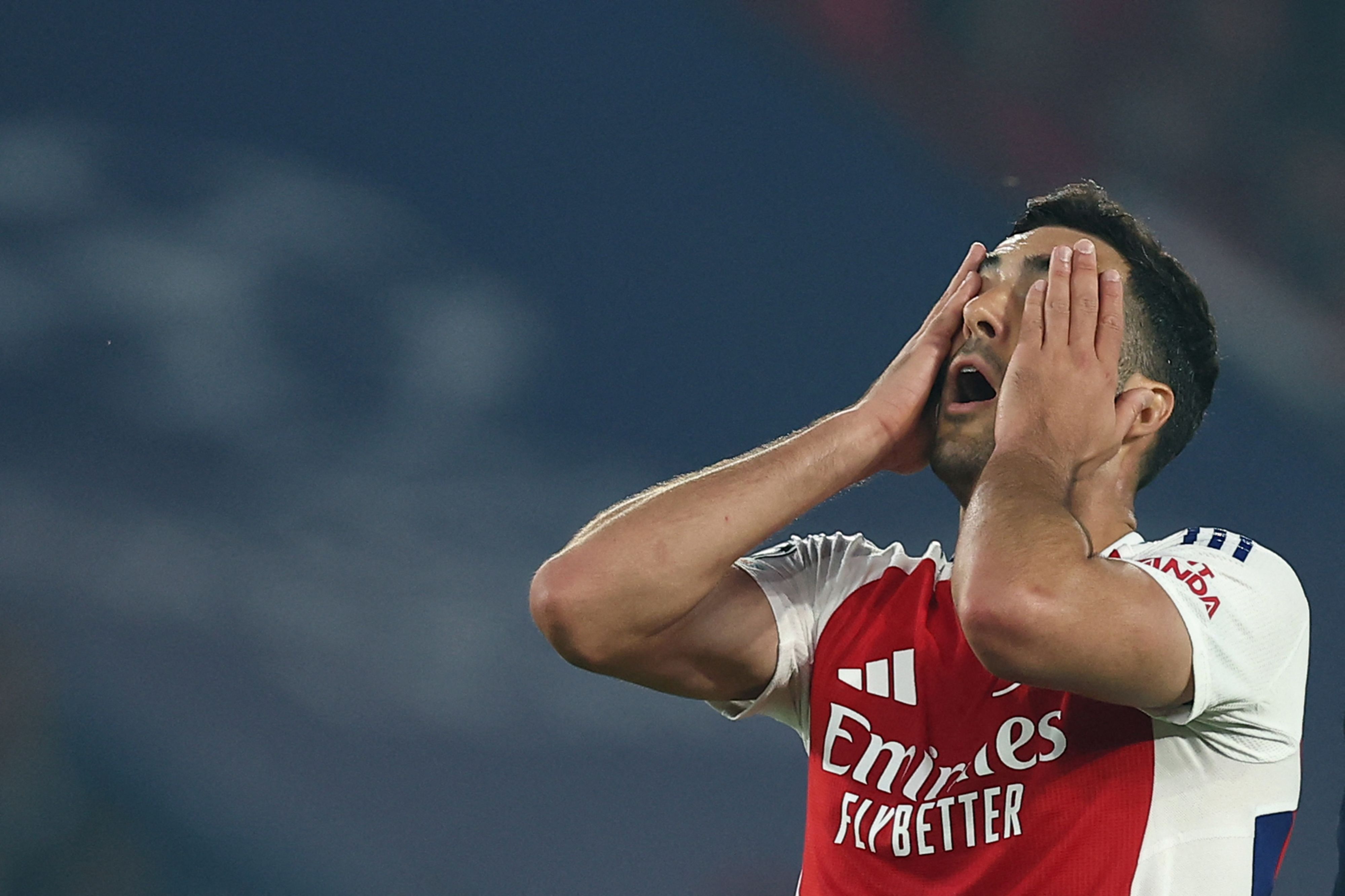 Arsenal's Spanish midfielder #23 Mikel Merino reacts after missing a goal opportunity during the UEFA Champions League semi-final second leg football match between Paris Saint-Germain (PSG) and Arsenal at the Parc des Princes stadium in Paris, on May 7, 2025. (Photo by Franck Fife/AFP Photo)