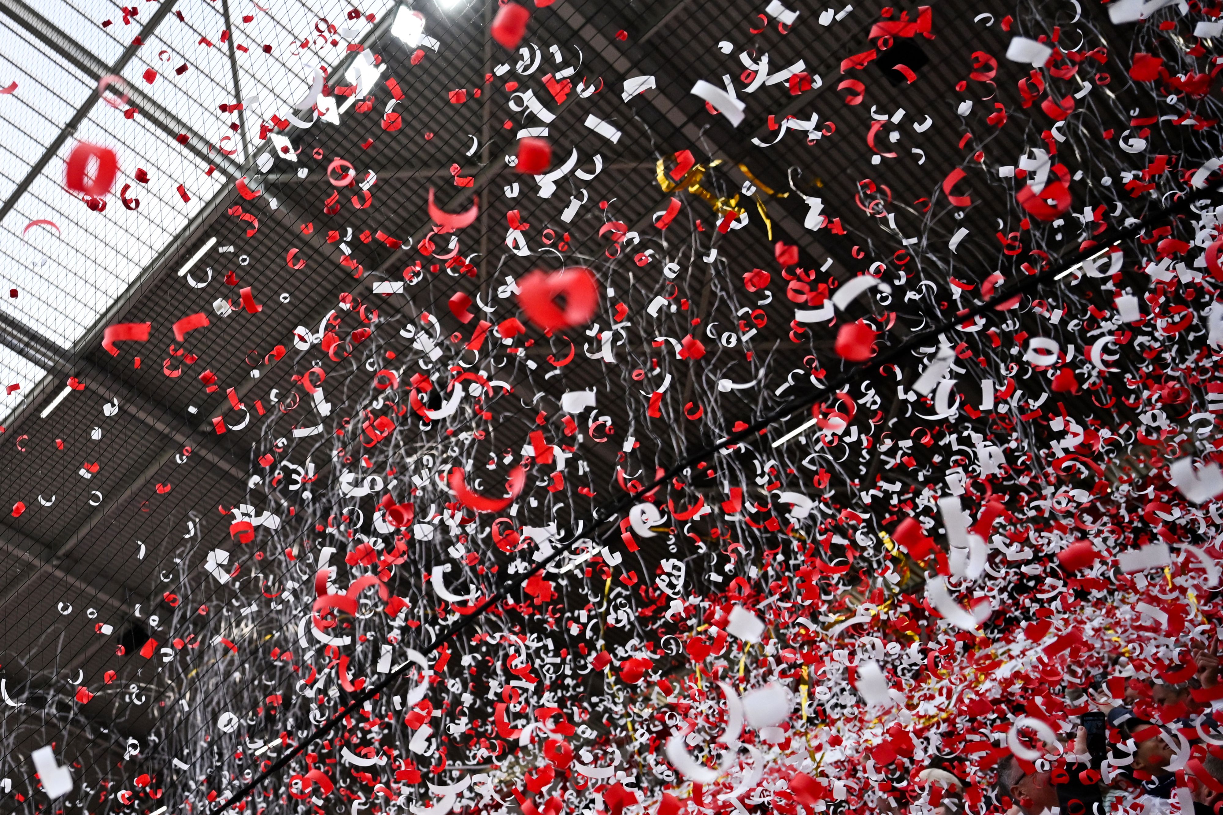 Confetti is thrown on Mainz' fans prior to the German first division Bundesliga football match between 1 FSV Mainz 05 and Eintracht Frankfurt in Mainz, western Germany on May 4, 2025. (Photo by Kirill Kudryavtsev/AFP Photo)
