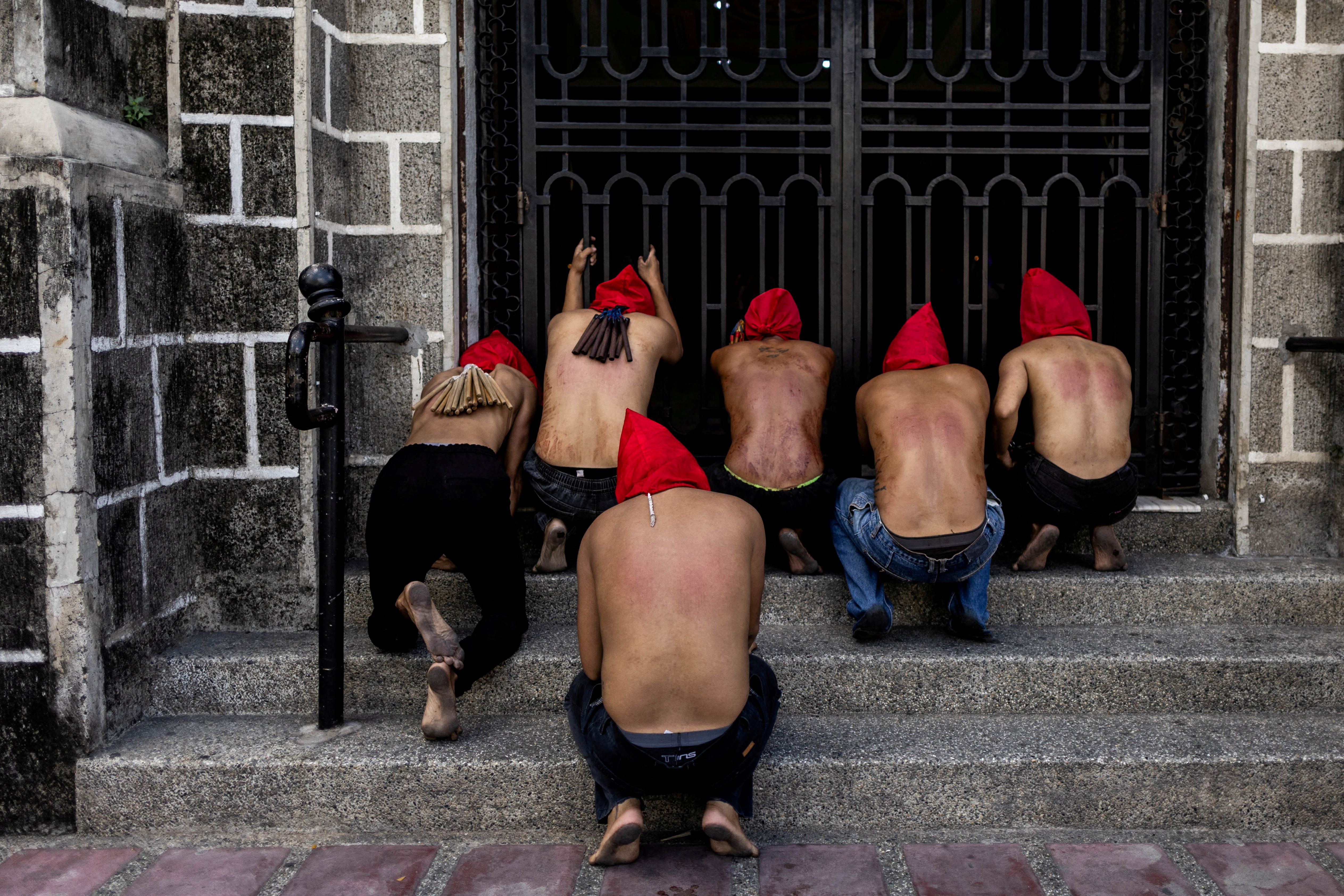 Filipino penitents kneel on the gates of a church on Maundy Thursday in Mandaluyong City, Metro Manila, Philippines, on April 17, 2025. (Photo by Eloisa Lopez/Reuters)