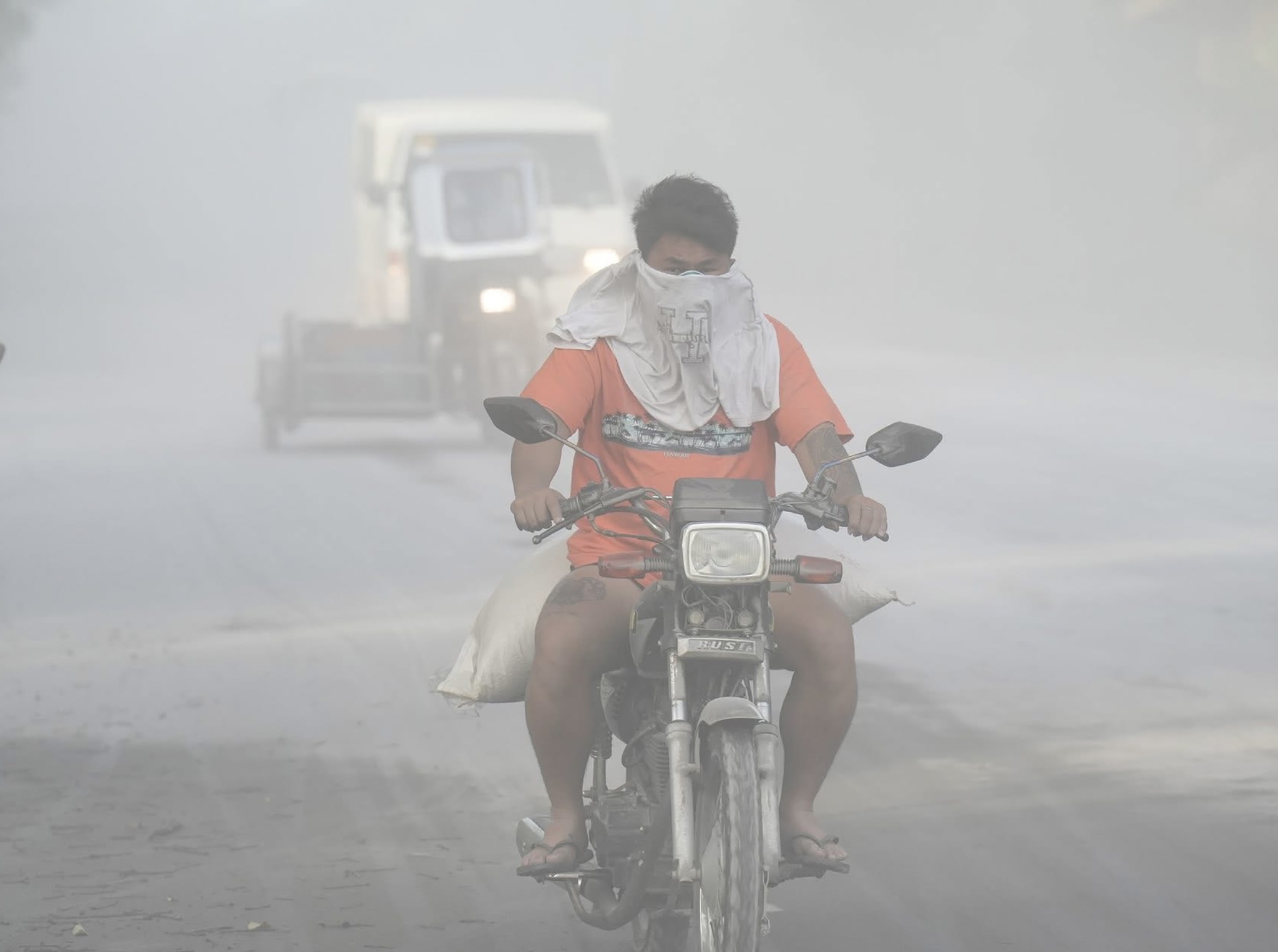 A handout photo made available by the Sorsogon Provincial Information Office (SPIO) shows motorists maneuvering along a road covered with volcanic ash from the Bulusan volcano, in the town of Juban, Sorsogon province, Philippines, 28 April 2025. The Bulusan Volcano in Sorsogon province, about 570 kilometers south of Manila, erupted on 28 April, according to the Philippine Institute of Volcanology and Seismology (Phivolcs) and its plumes reached 4,500 meters high. (Photo by SPIO/EPA)