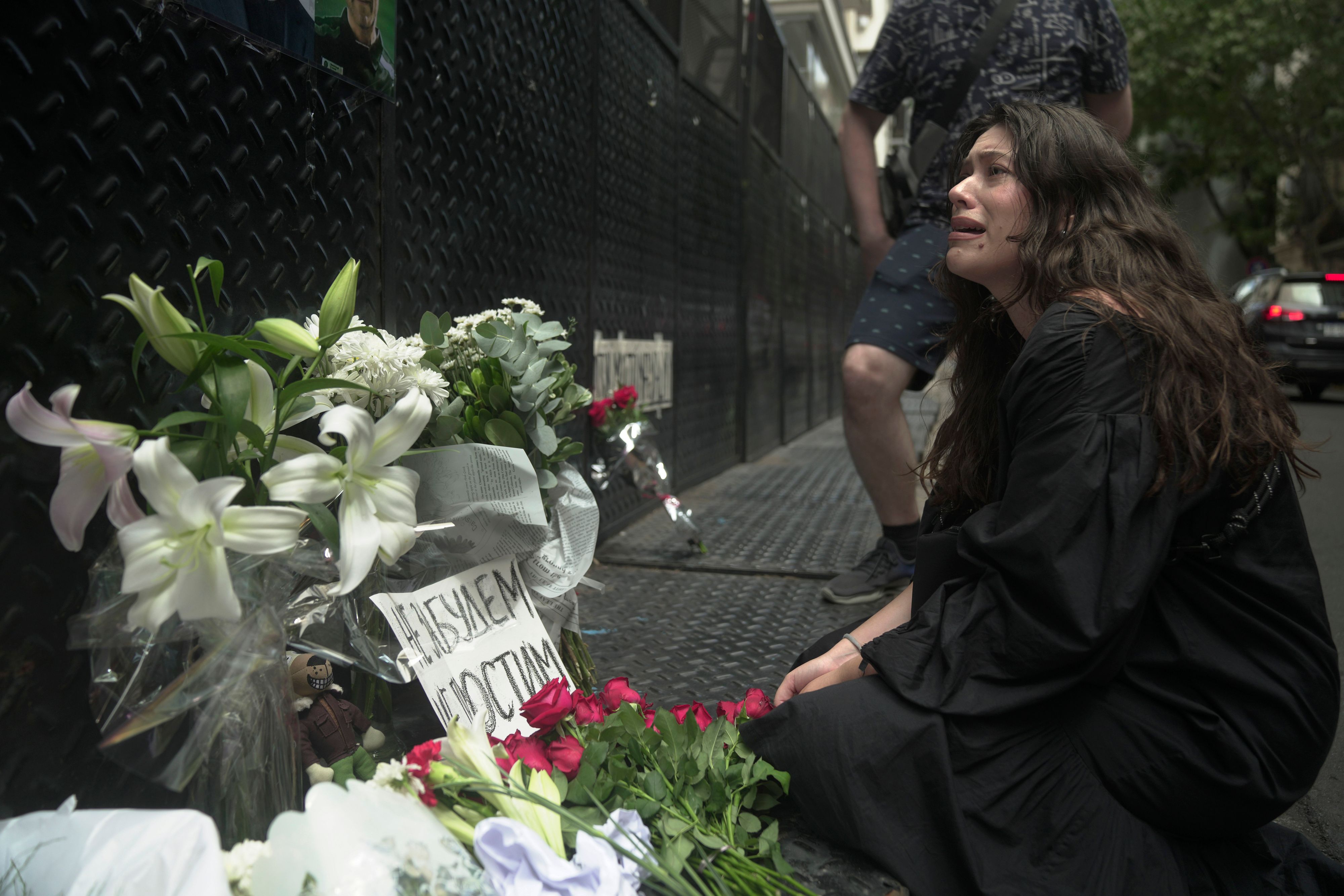 A woman cries as she places flowers outside the Russian Embassy in memory of Alexei Navalny in Buenos Aires, Argentina, Friday, February 16, 2024. Navalny, who crusaded against official corruption and staged massive anti-Kremlin protests as President Vladimir Putin's fiercest foe, died Friday in the Arctic penal colony where he was serving a 19-year sentence, Russia's prison agency said. He was 47. (Photo by Victor R. Caivano/AP Photo)