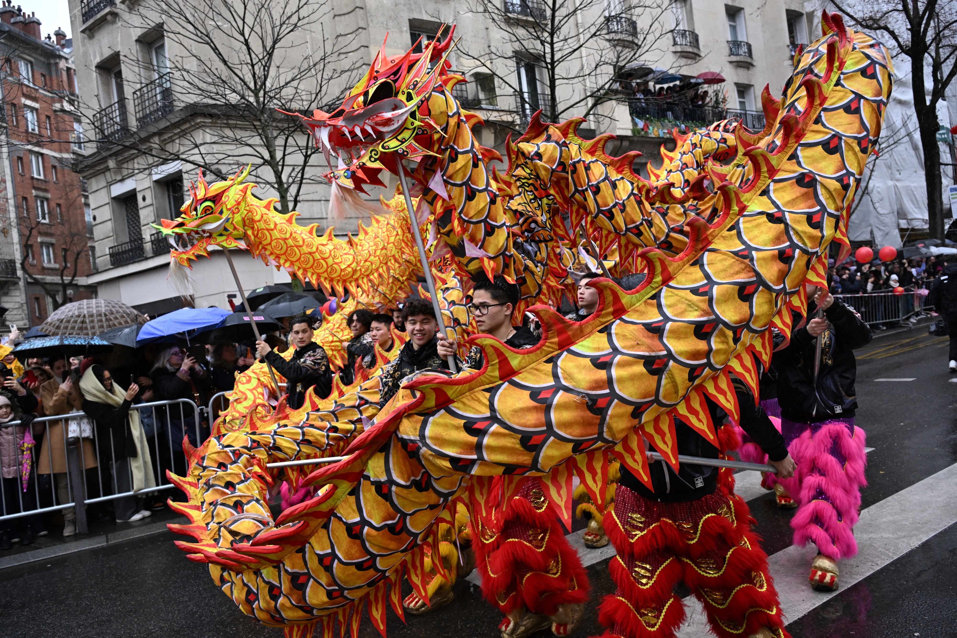 Members of the Chinese community take part in a parade celebrating the Chinese Lunar New Year in Paris on February 18, 2024. (Photo by Bertrand Guay/AFP Photo)