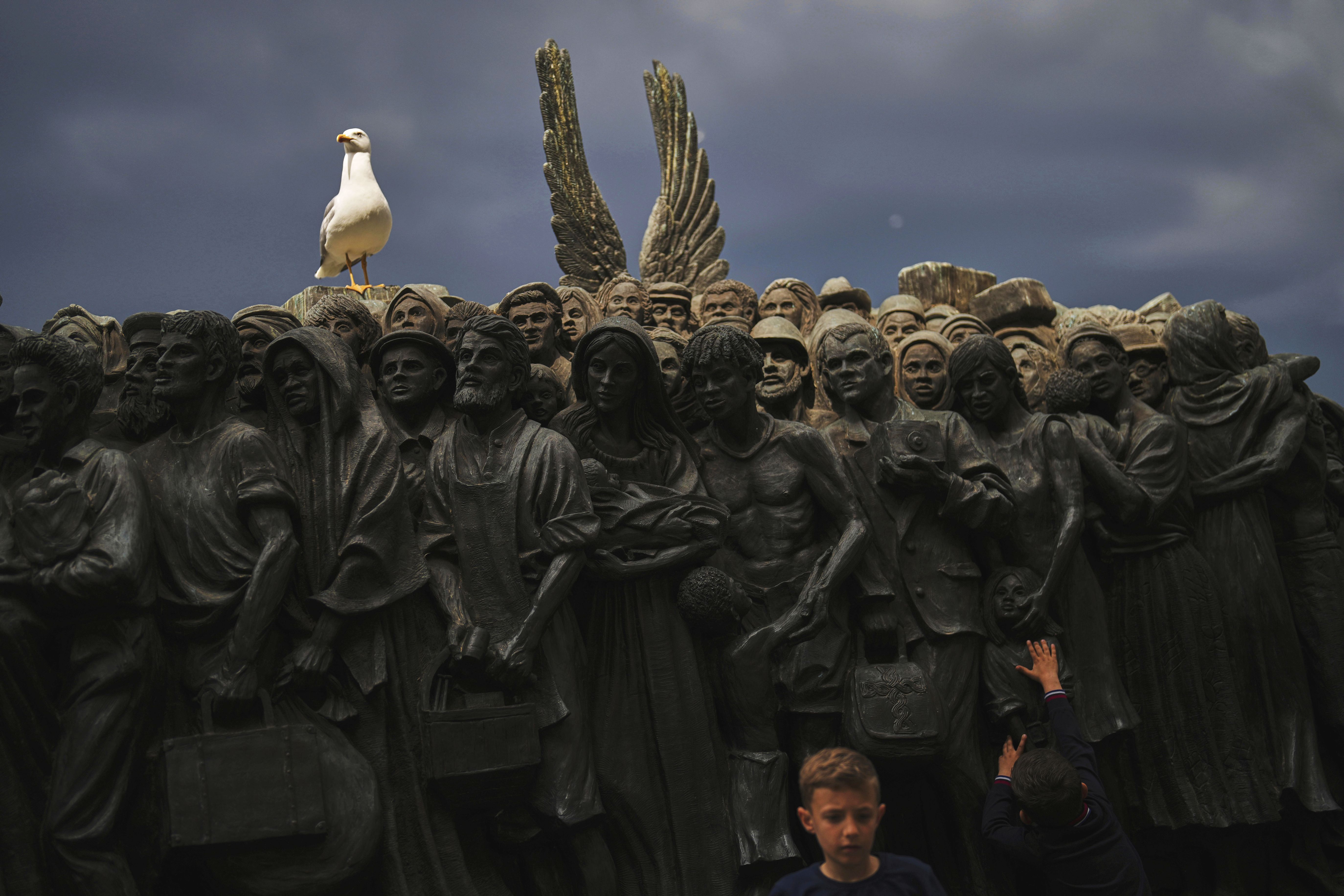 Children visit the “Angels Unaware” boat sculpture by Canadian artist Timothy P. Schmalz dedicated to migrants, as a seagull perches on its apex, in St. Peter's Square at the Vatican, April 28, 2025. (Photo by Francisco Seco/AP Photo)