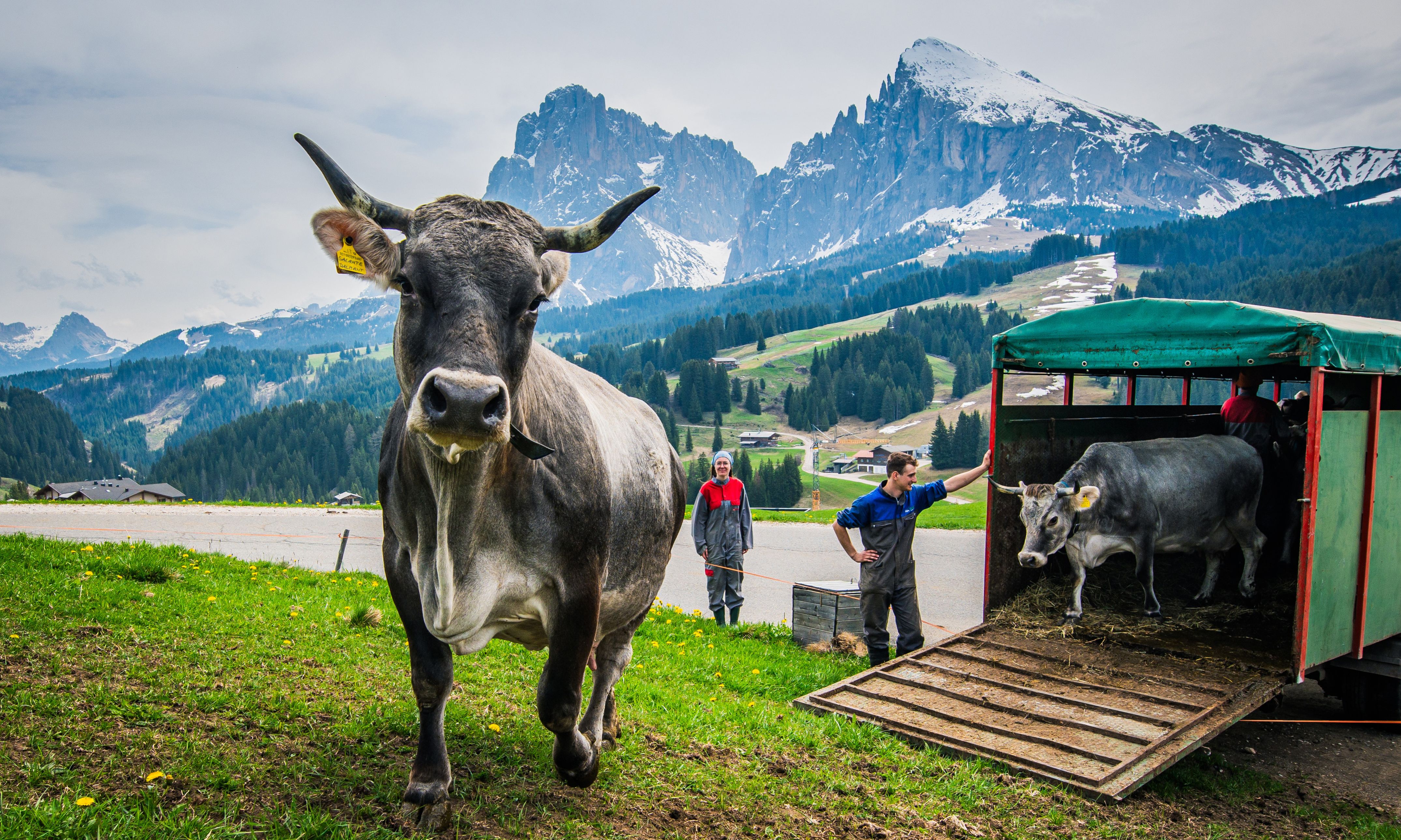 Tractors take Matthias Rier's cows up to the alpine pasture on May 03, 2025 in Alpe of Siusi, Castelrotto, Italy. Matthias Rier is the third in lineage of the Rier family who, together with his wife and their children, run a herd of alpine cows for milk production on the Seiser Alm, Europe's largest, and live according to the rhythms of nature and tradition, thus keeping the alp and surrounding areas clean and in harmony with natural cycles, and also run a tourist farm. (Photo by Simone Padovani/Getty Images)