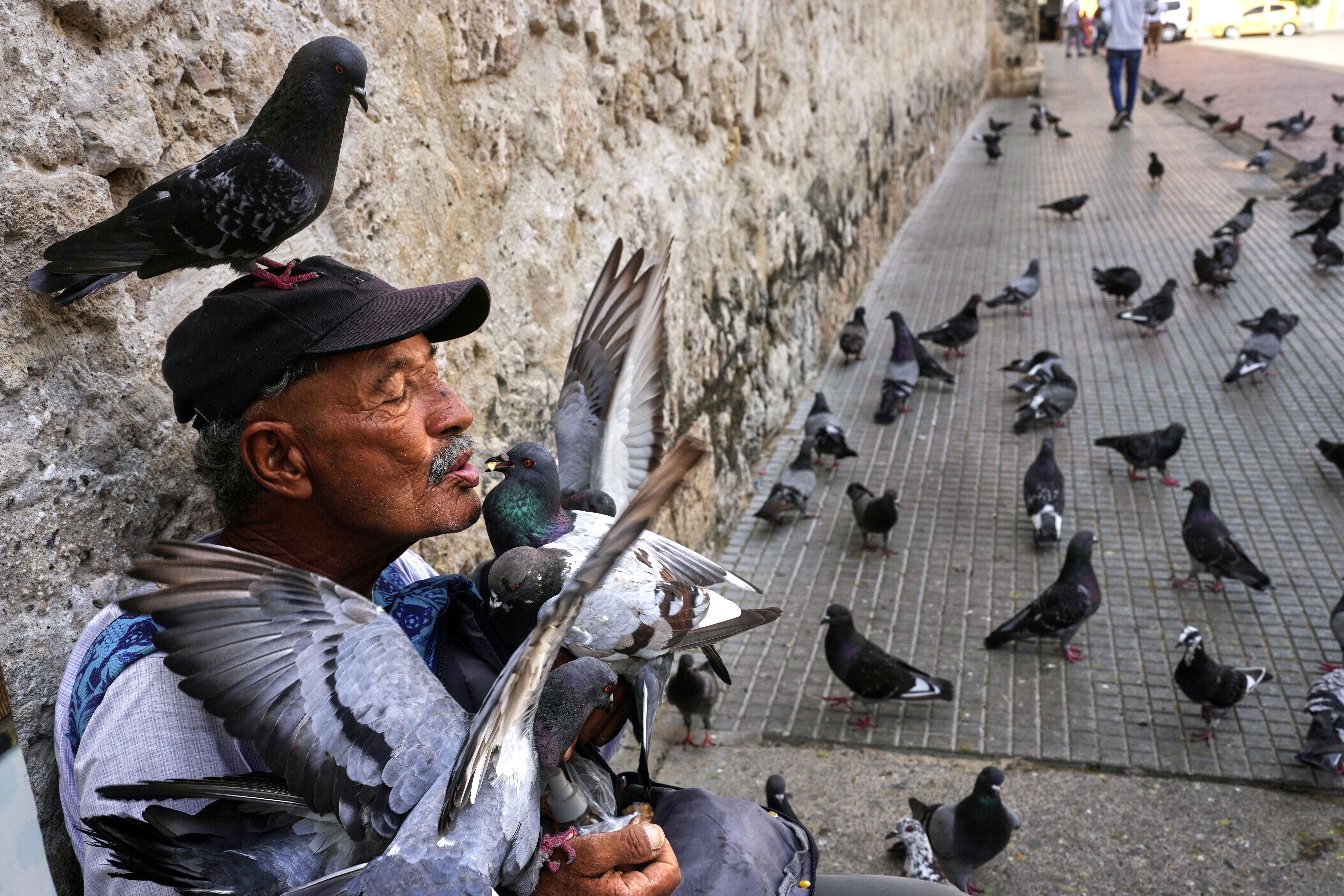 Jean Paul Correa Vasco feeds pigeons outside the Cathedral in Cartagena, Colombia, Thursday, May 8, 2025. (Photo by Rodrigo Abd/AP Photo)