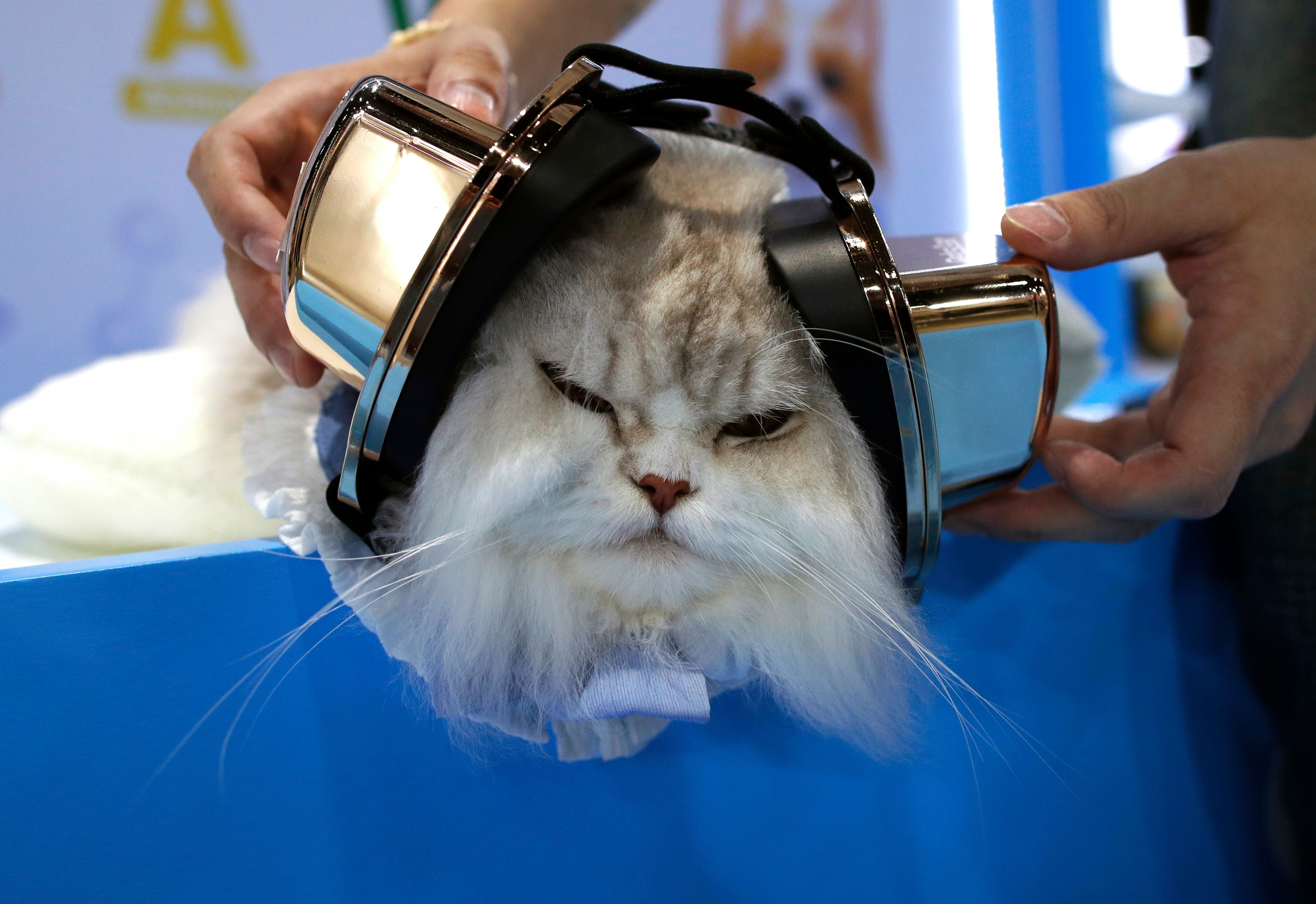A cat wears an earmuff product used to protect pets from loud noise during the Pet Expo Thailand 2025 in Bangkok, Thailand, 01 May 2025. The annual Pet Expo trade runs from 01 to 04 May. (Photo by Rungroj Yongrit/EPA/EFE)