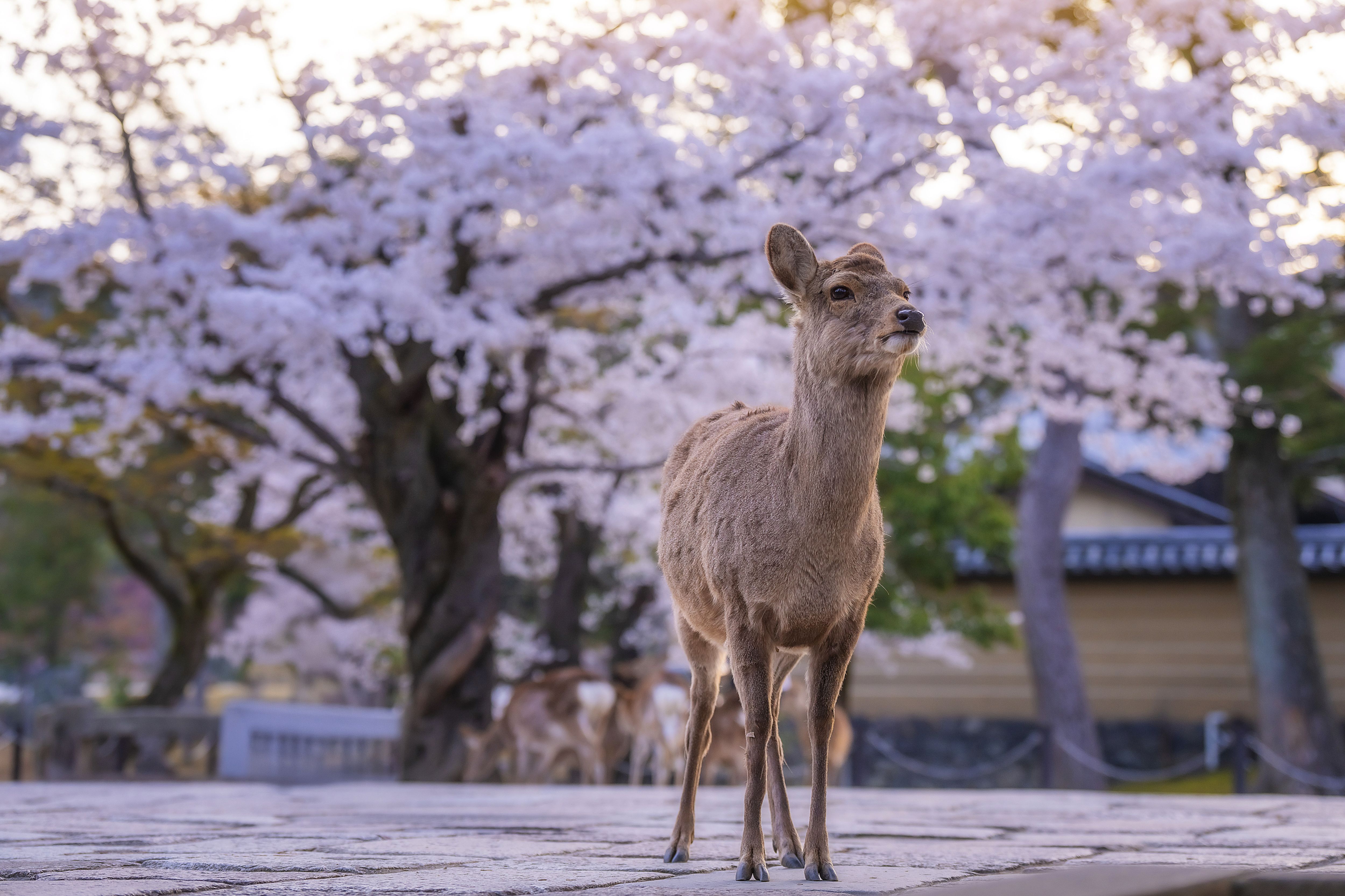 A sika deer is seen at Nara Park, established in 1880 located at the foot of Mount Wakakusa (Mikasa) with its historical buildings and natural beauties, in Nara, Japan on May 04, 2025. The park is considered a natural treasure and is home to many wild animals and various plant species. Sika deer, a species native to East Asia and numbering more than 1,200, are among the symbols of the park and live among the sakura trees identified with the country. (Photo by Fatih Gonul/Anadolu via Getty Images)