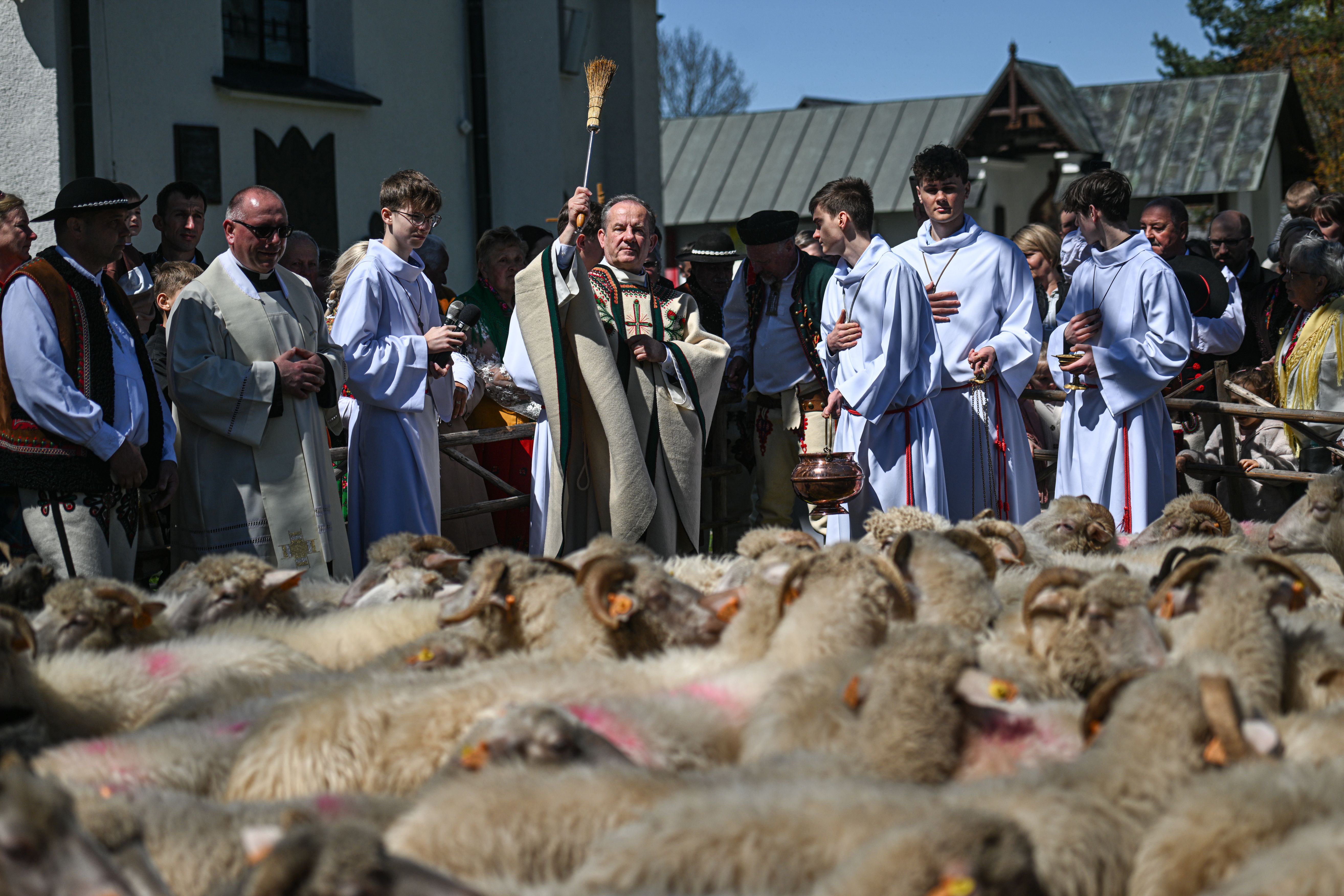 A priest blesses sheep during the Redyk, a celebration to start the sheep grazing season in Ludzmierz, Poland on April 27, 2025. Every year, shepherds and their sheep visit the local church to celebrate the start of the grazing season, pray for a good grazing and receive holy water and wooden strains. (Photo by Omar Marques/Anadolu via Getty Images)