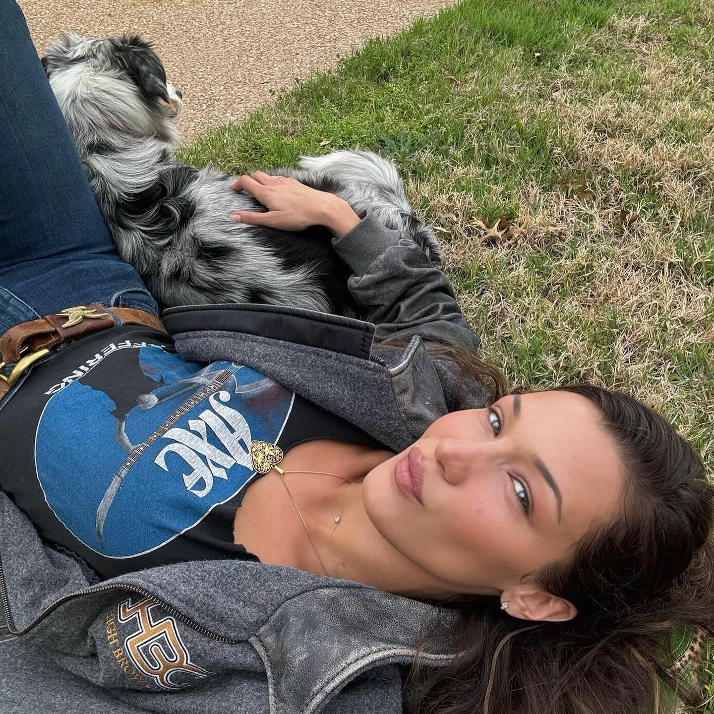 American model Bella Hadid in the second decade of April 2025 lounges in a grass while cuddling a pup. (Photo by bellahadid/Instagram)