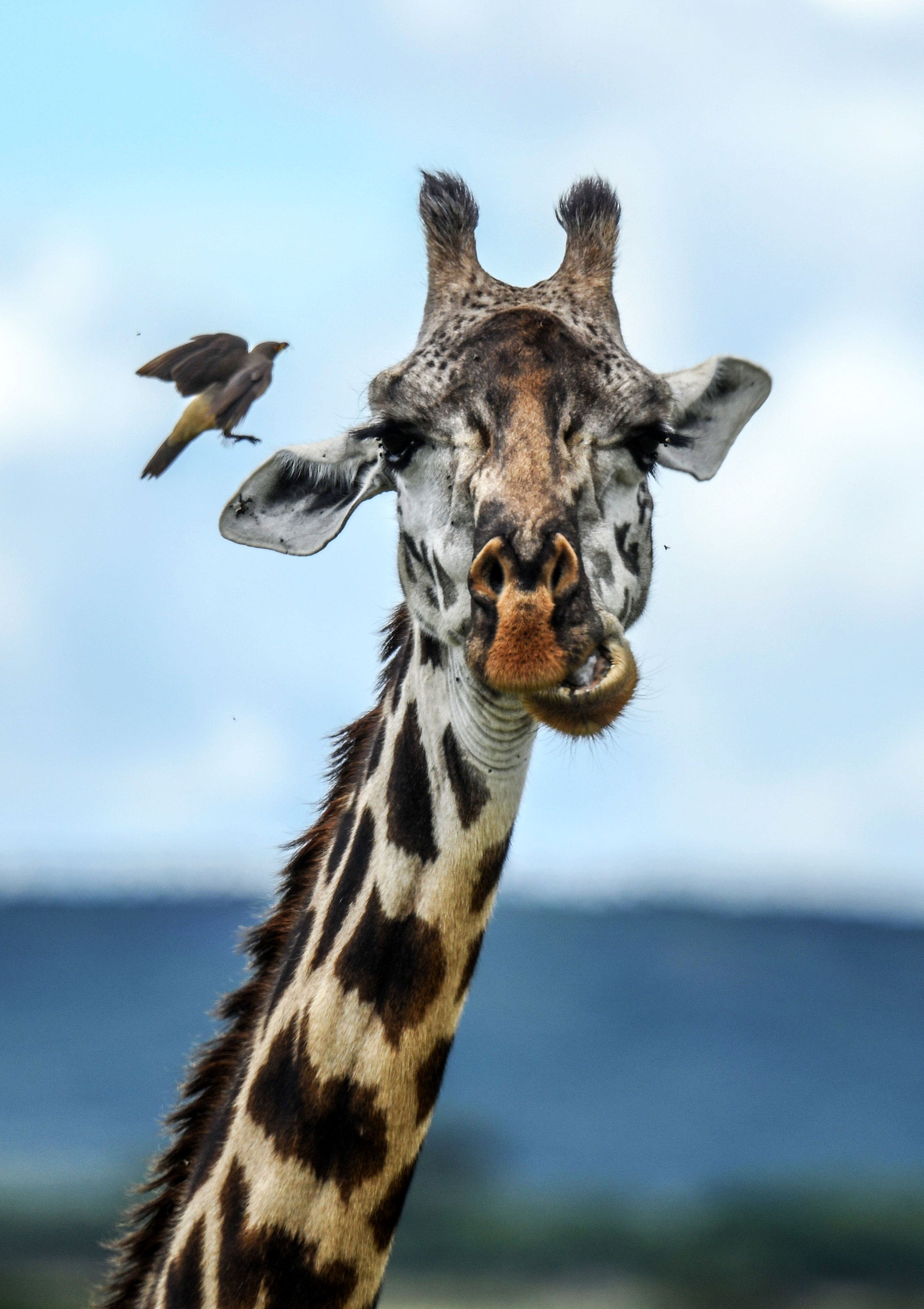 A bird is seen near a giraffe at the Maasai Mara National Reserve, which is home to dozens of species of wildlife such as lions, leopards, cheetahs, elephants, giraffes, zebras and antelopes, in Kenya on May 06, 2025. Every year, millions of wildlife animals migrate from the Serengeti National Park in Tanzania to the Maasai Mara, a natural habitat within Kenya's borders. (Photo by Gerald Anderson/Anadolu via Getty Images)