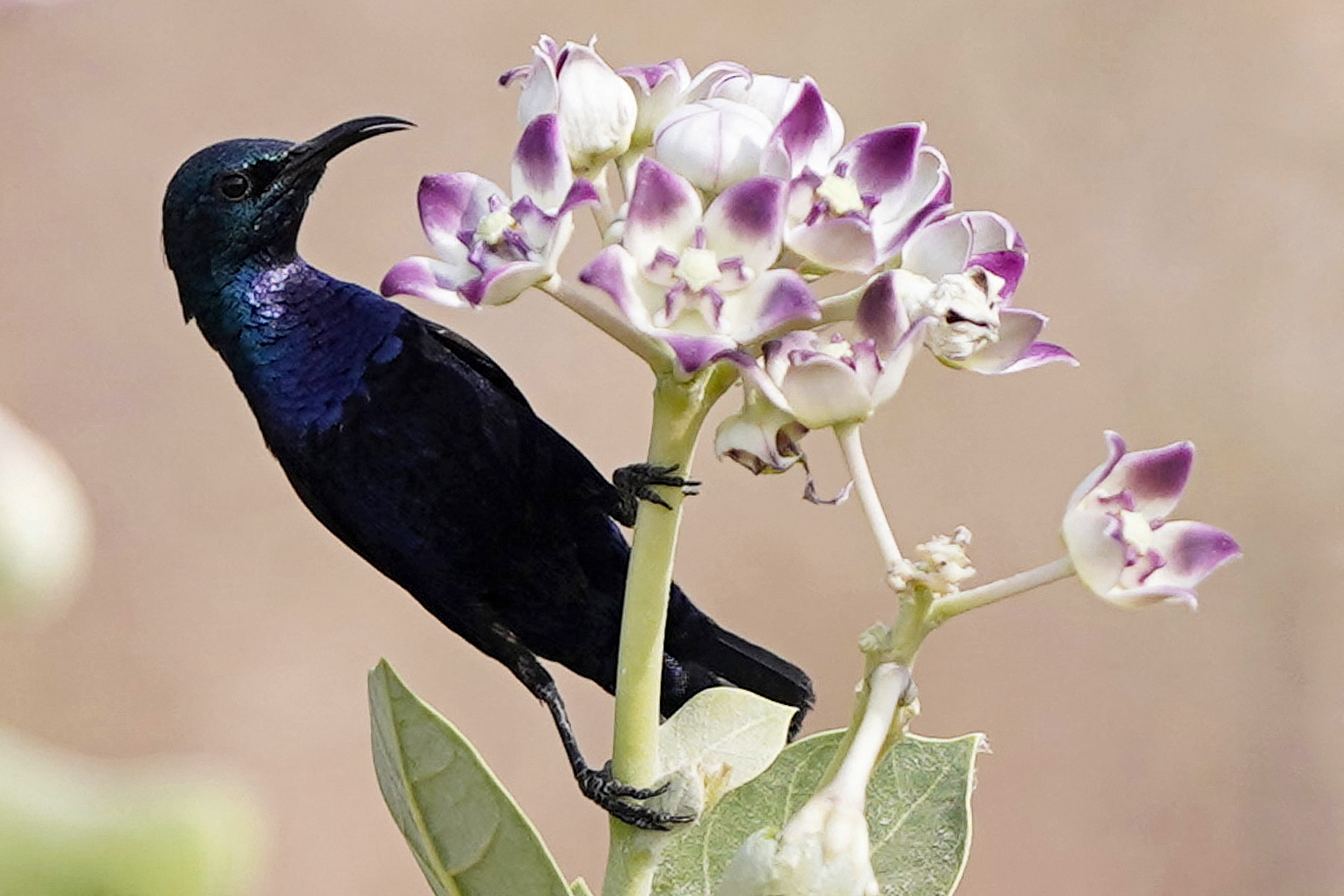 A purple sunbird perches on a flower stem on the outskirts of Ajmer, India on May 4, 2025. (Photo by Himanshu Sharma/AFP Photo)
