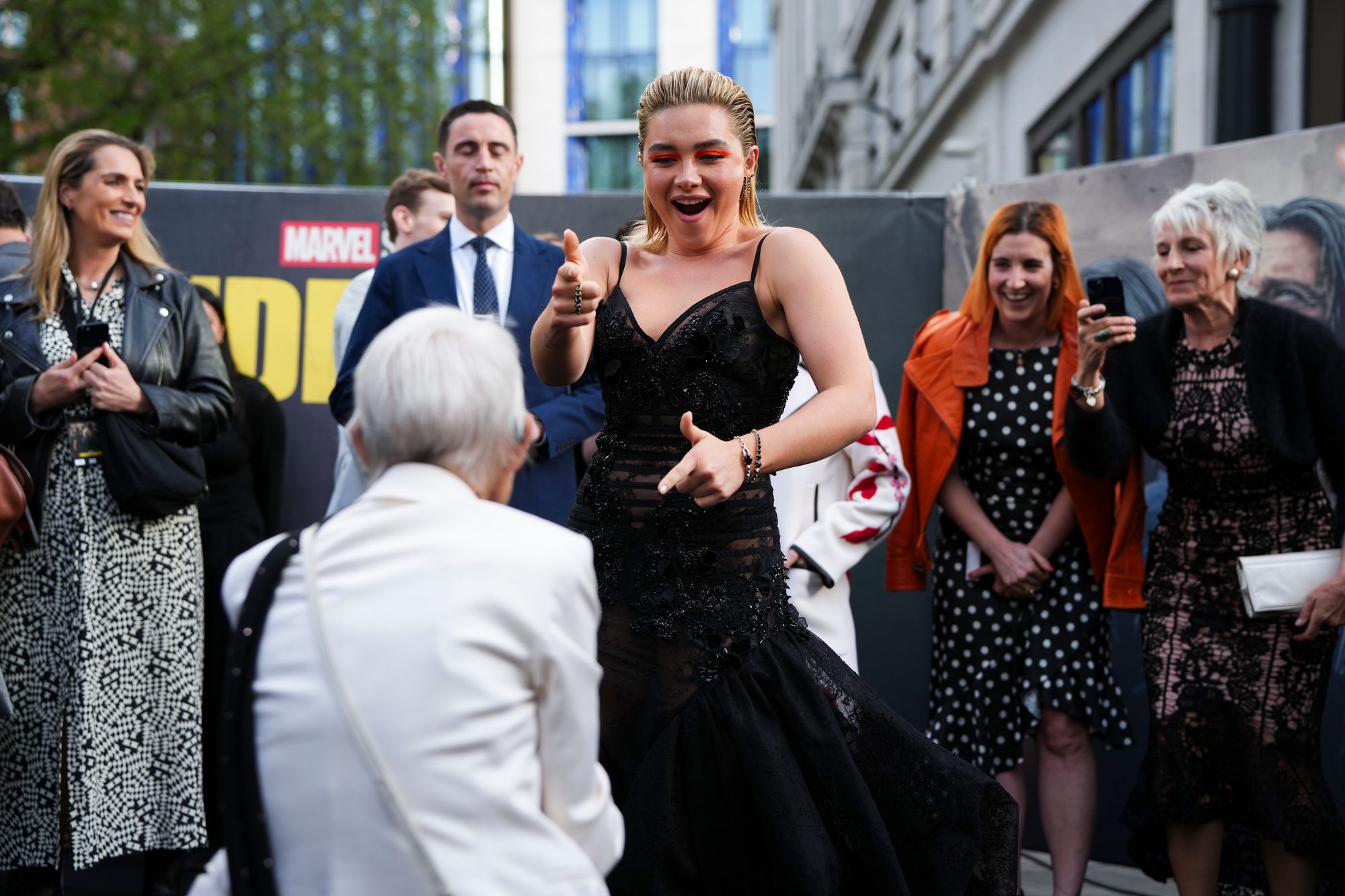English actress Florence Pugh poses for photographers upon arrival at a screening of the film “Thunderbolts” on Tuesday, April 22, 2025, in London. (Photo by Scott A. Garfitt/Invision/AP Photo)