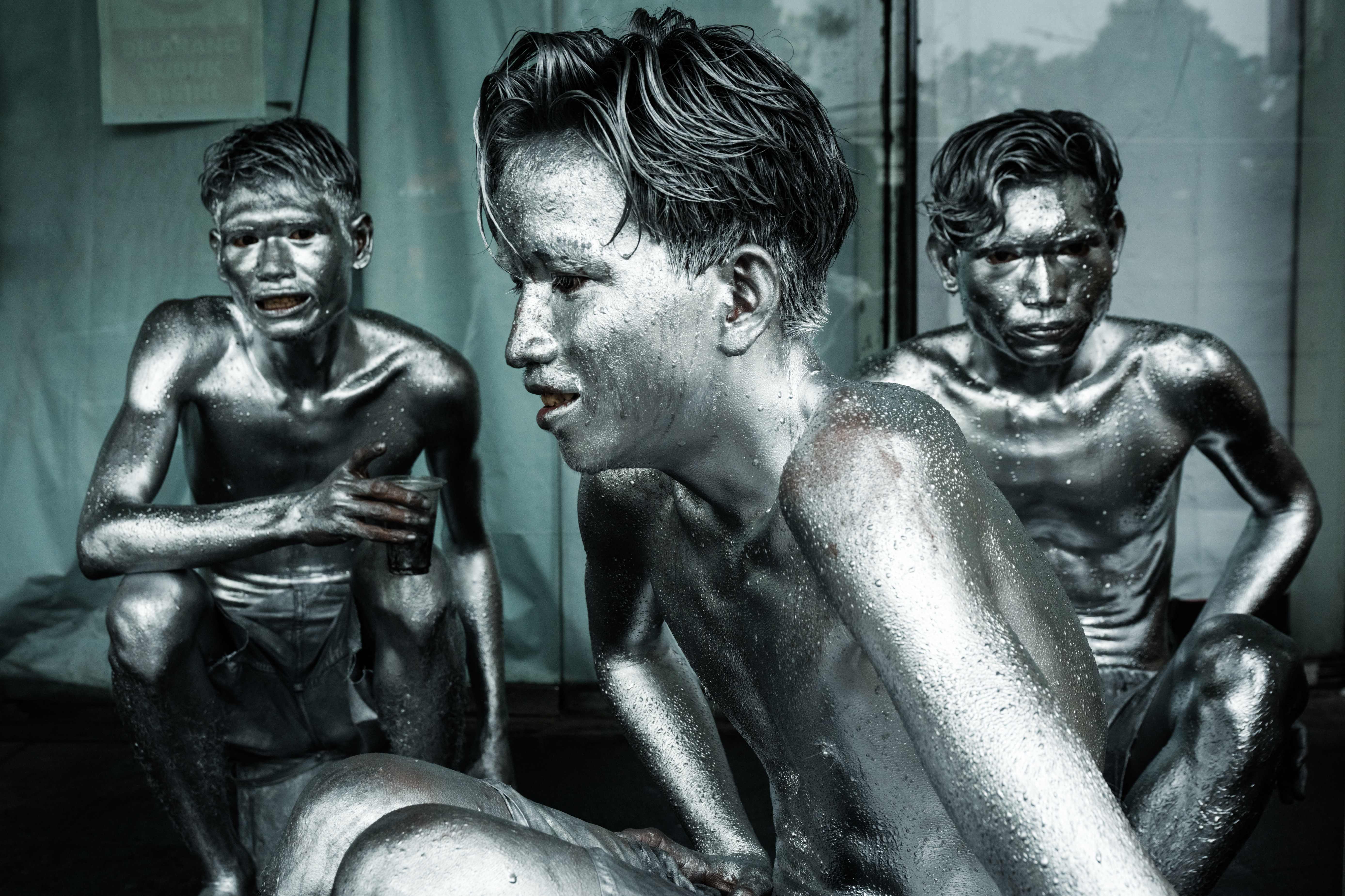 This photo taken on April 1, 2025 shows street performers Keris Munandar (L), his brother Ari Munandar (R), and their neighbour Riyan Ahmad Fazriyansah, taking shelter from the rain during their performance at an intersection in Jakarta. On a rainy day in Indonesia's capital Jakarta, three men coated in metallic paint known as the “manusia silver”, or silvermen, brave the elements at an intersection near a mall to ask drivers for change. (Photo by Yasuyoshi Chiba/AFP Photo)