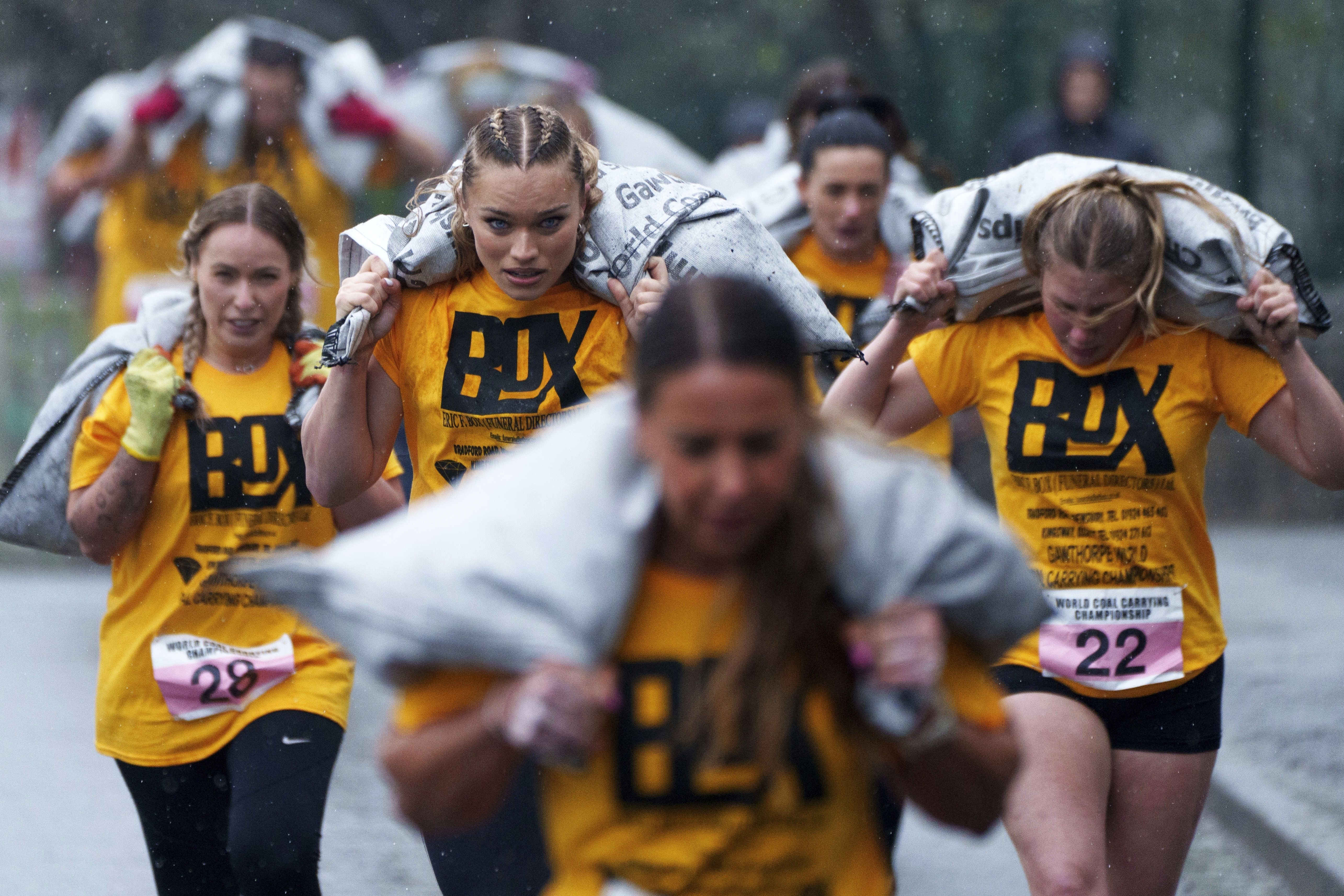 Women's race competitors, including Jodie Ounsley, center, who plays Fury in the British TV show “Gladiators”, run with a 20kg sack of coal over a 1.1km course during the World Coal Carrying Championships in Ossett, West Yorkshire, England, Monday, April 21, 2025. (Photo by Jon Super/AP Photo)