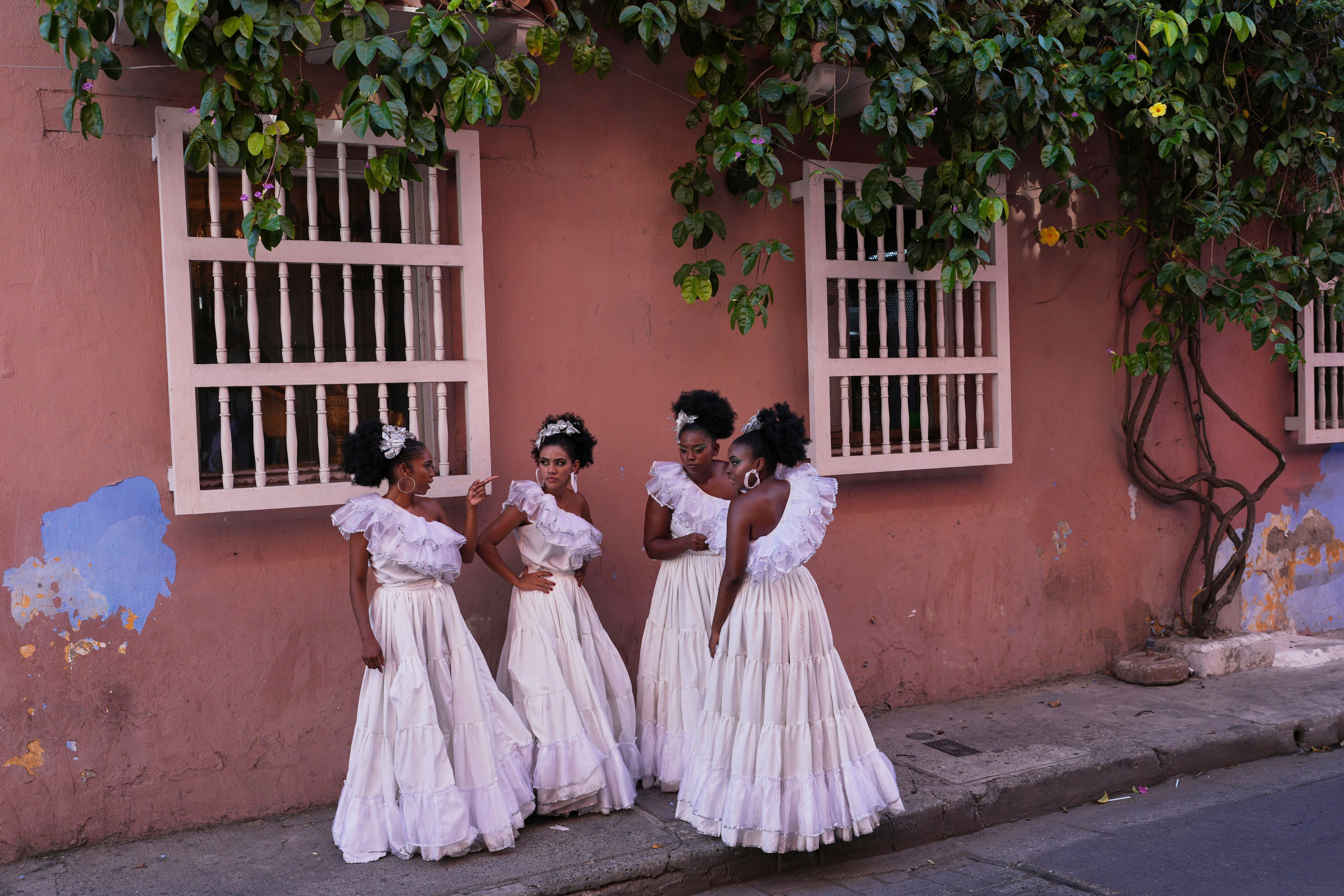 Dancers gather on a sidewalk after performing at a wedding in Cartagena, Colombia, Saturday, May 10, 2025. (Photo by Rodrigo Abd/AP Photo)