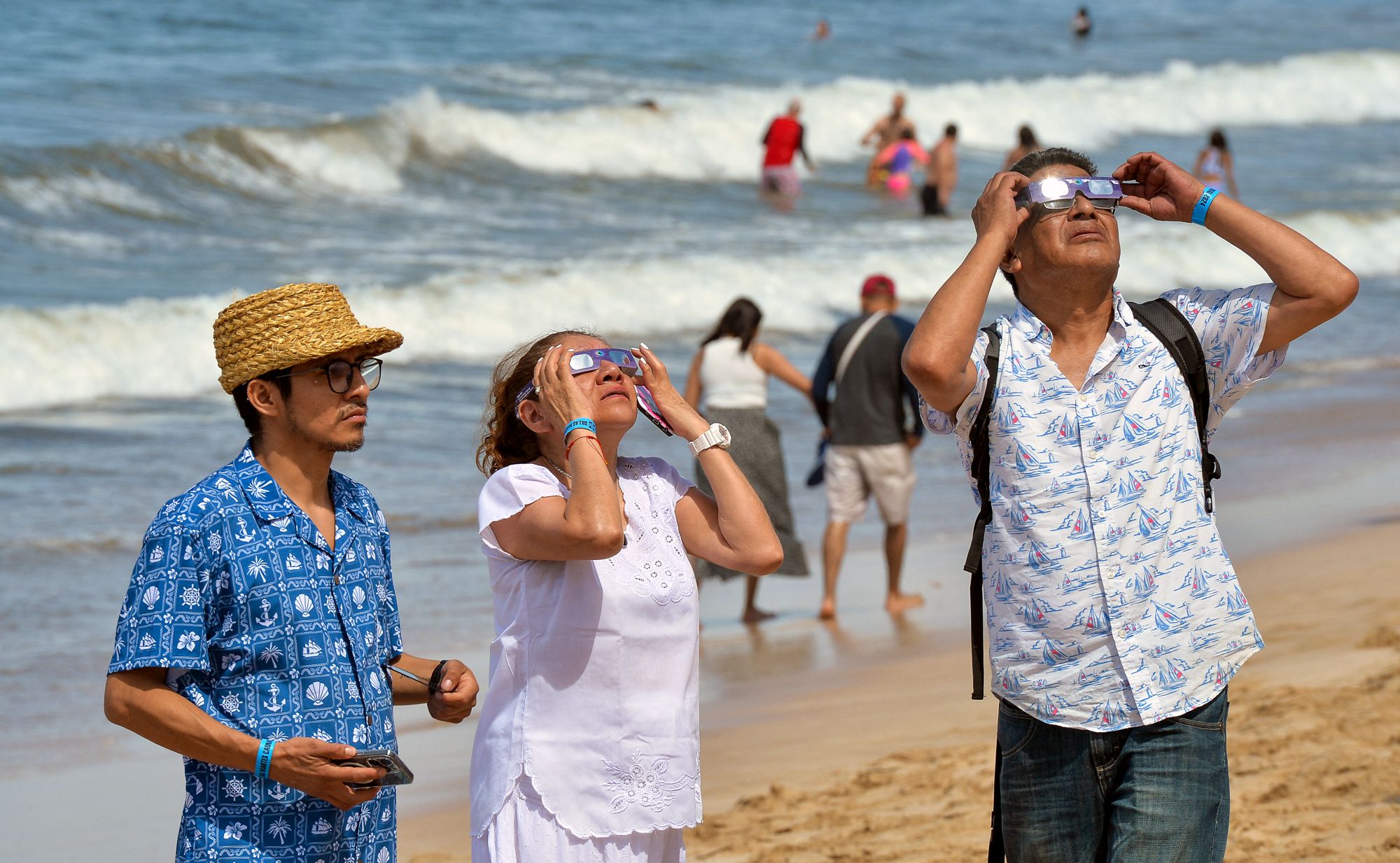 People look toward the sky as the moon begins to partially eclipse the sun at the beach in Mazatlan, Sinaloa State, Mexico, on April 8, 2024. This year's path of totality is 115 miles (185 kilometers) wide and home to nearly 32 million Americans, with an additional 150 million living less than 200 miles from the strip. The next total solar eclipse that can be seen from a large part of North America won't come around until 2044. (Photo by Mario Vazquez/AFP Photo)