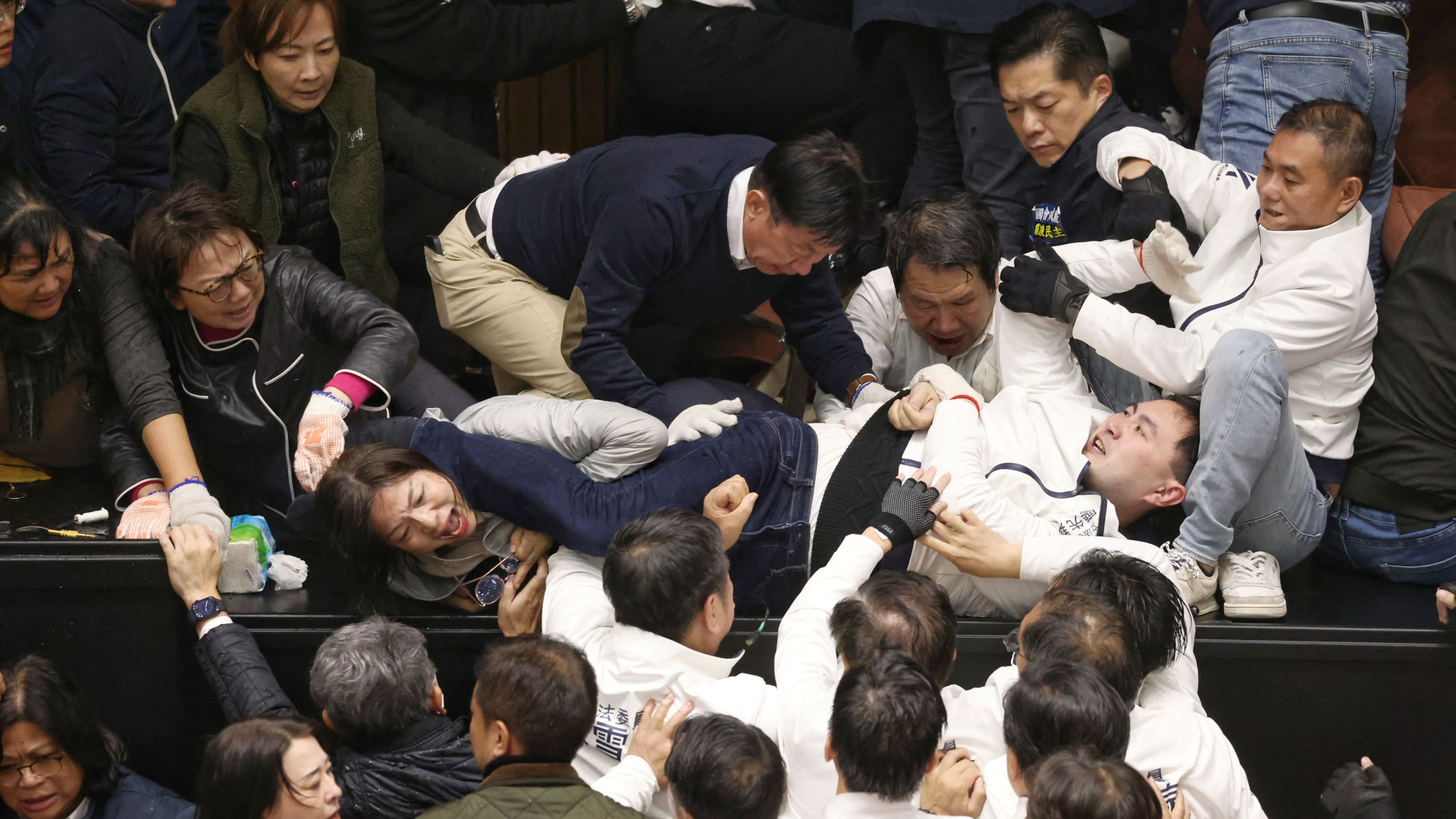 Lawmakers from the Democratic Progressive Party (DPP) and opposition party Kuomintang (KMT) (in white) brawl over the third reading of amendments to the Civil Servants Election and Recall Act and other controversial bills at the Legislative Yuan in Taipei on December 20, 2024. (Photo by I-Hwa Cheng/AFP Photo)