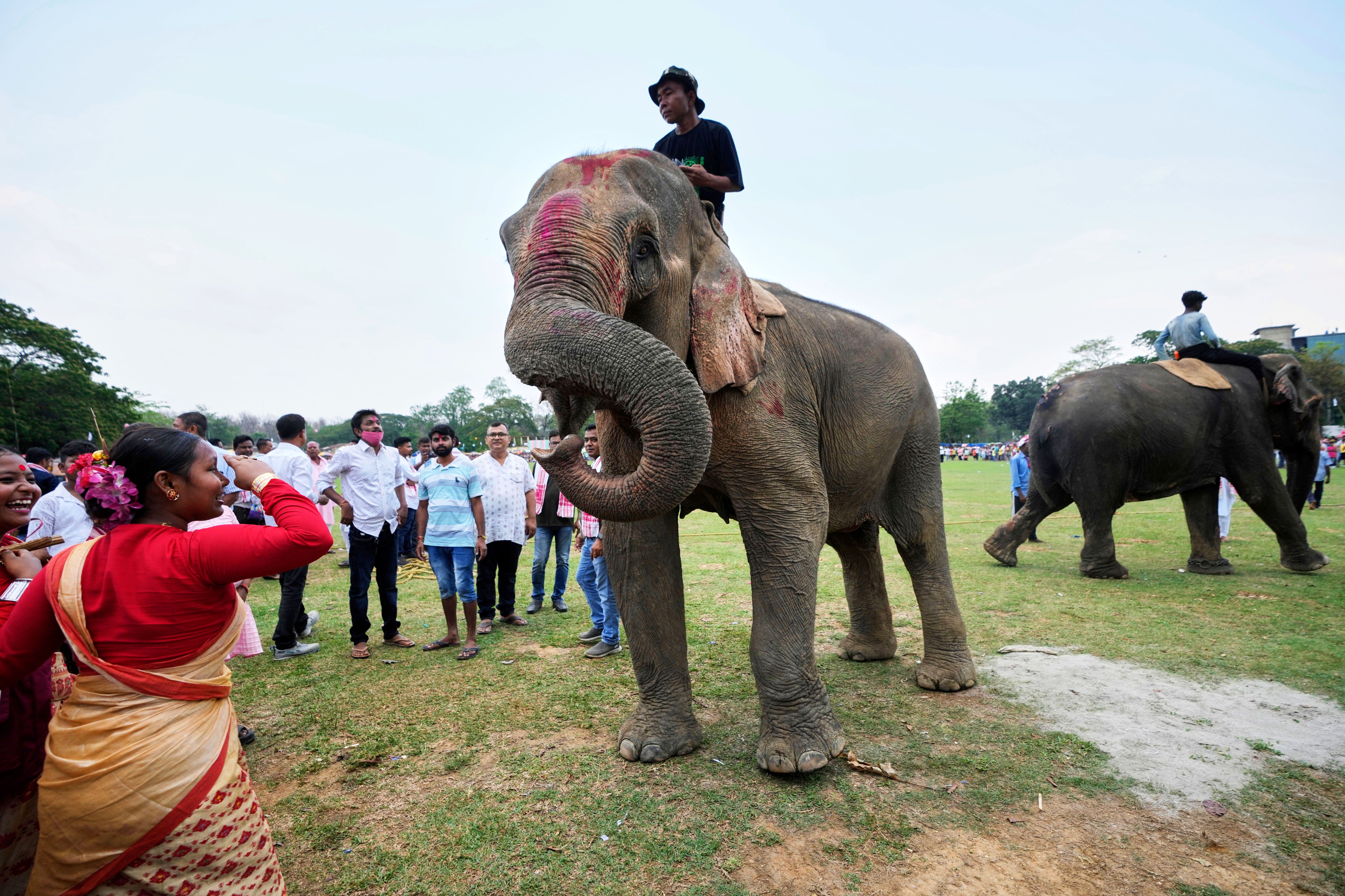 An Assamese girl salutes to an elephant during the Suori tribal festival in Boko, west of Guwahati, India, Saturday, April 19, 2025. (Photo by Anupam Nath/AP Photo)
