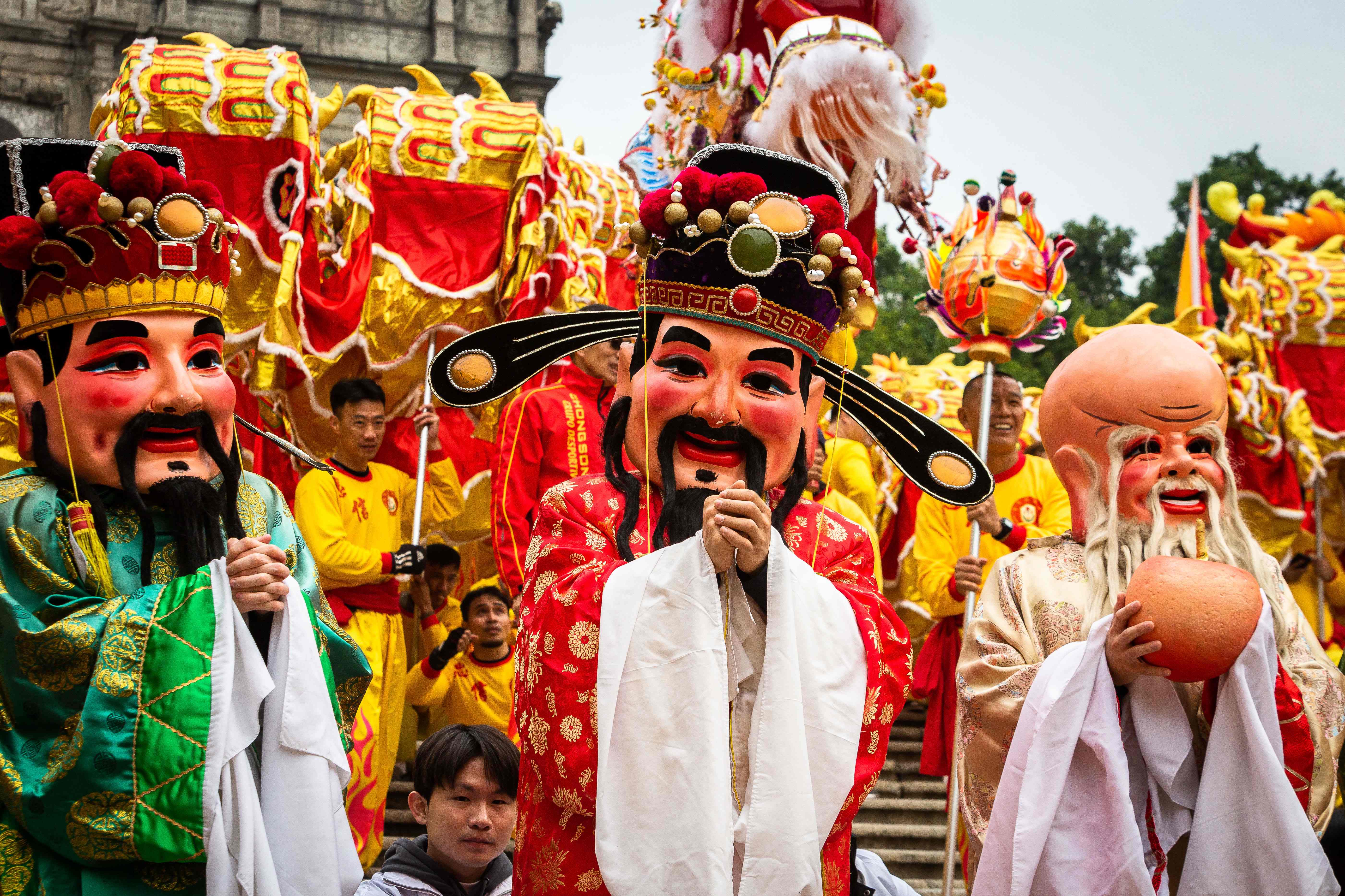 A human puppet of Tsai Shen Yeh, the God of Wealth, parades in front of the St. Paul's Ruins during celebrations in Macau on February 10, 2024, on the first day of the Lunar New Year of the Dragon. (Photo by Eduardo Leal/AFP Photo)