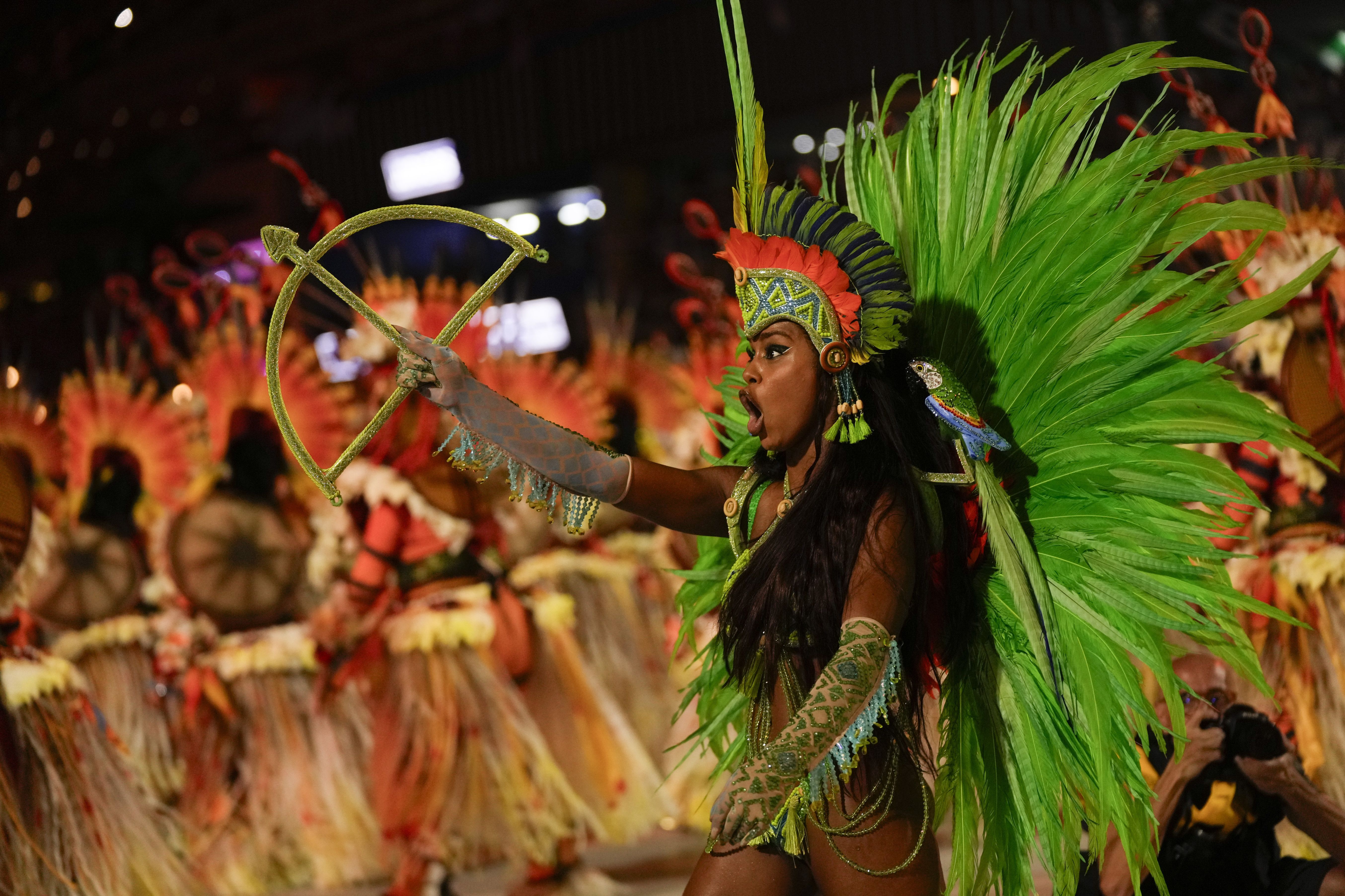 A performer from the Salgueiro samba school parades during Carnival celebrations at the Sambadrome in Rio de Janeiro, Brazil, Monday, February 12, 2024. (Photo by Silvia Izquierdo/AP Photo)