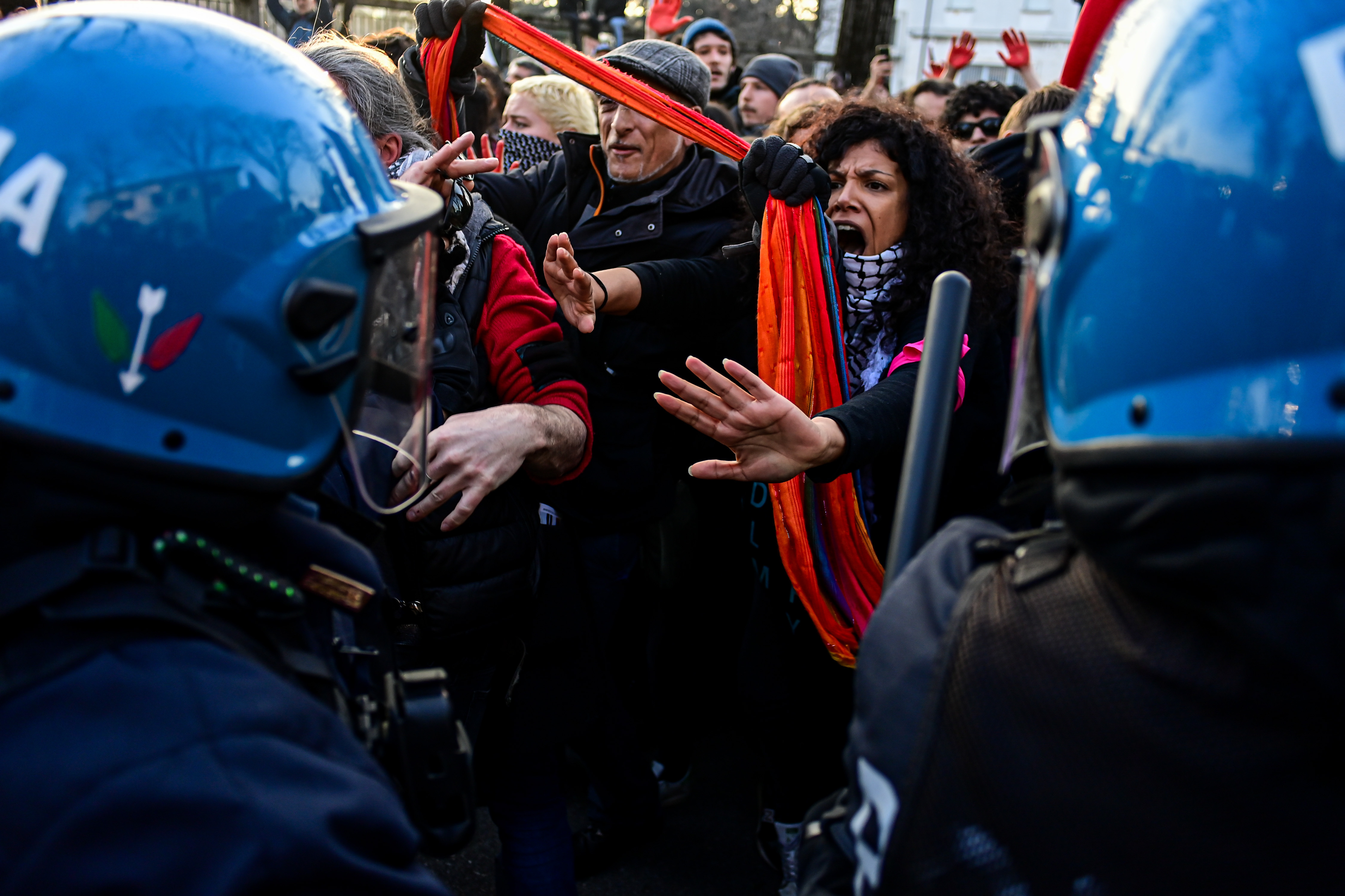 Demonstrators clash with the Police during a protest outside EOS Show 2024, the biggest Italian outdoor and hunting fair asking for an immediate global ceasefire in Verona, Italy on February 17, 2024. (Photo by Piero Cruciatti/Anadolu via Getty Images)