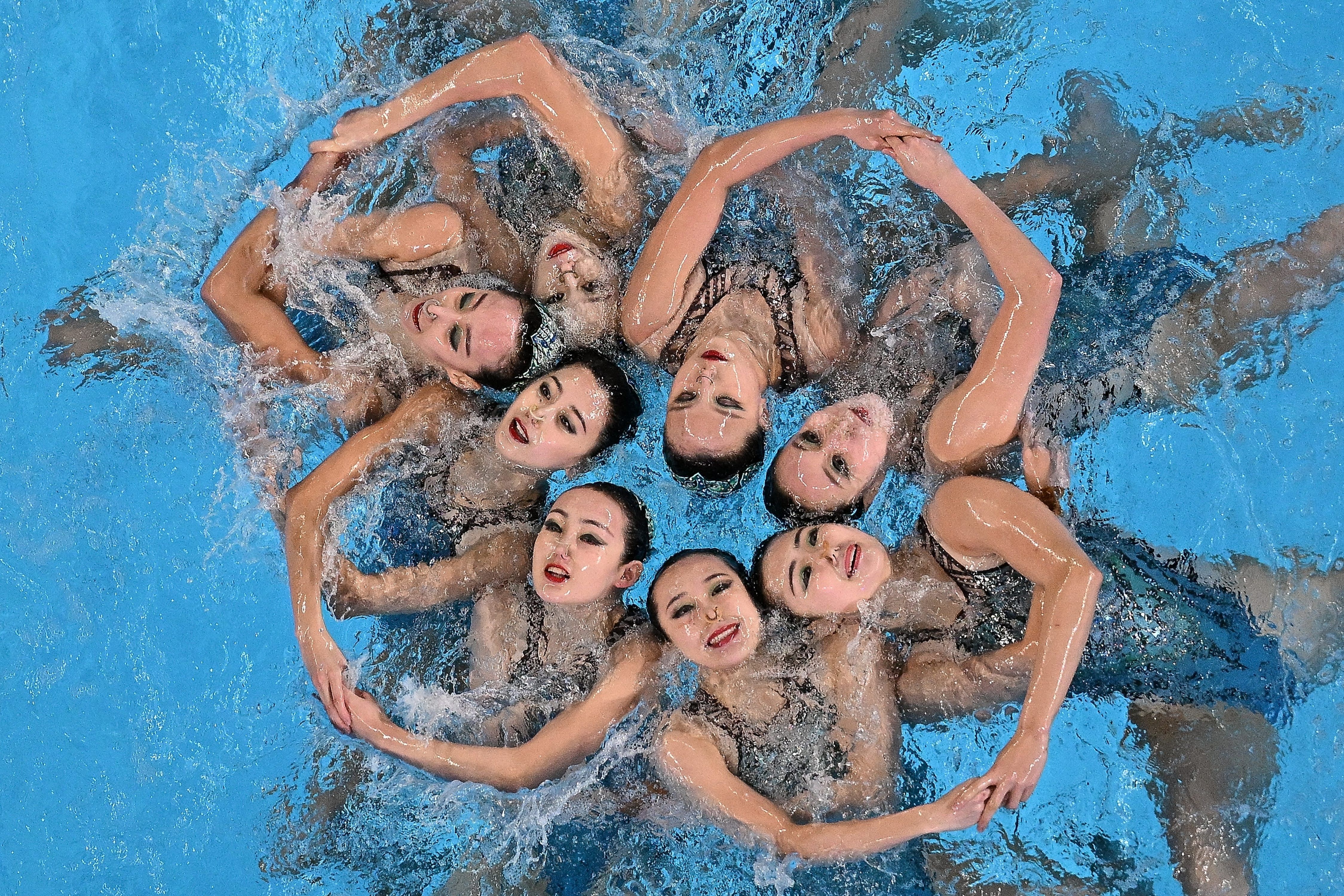 China's team compete in the final of the team free artistic swimming event during the 2024 World Aquatics Championships at Aspire Dome in Doha on February 9, 2024. (Photo by Manan Vatsyayana/AFP Photo)