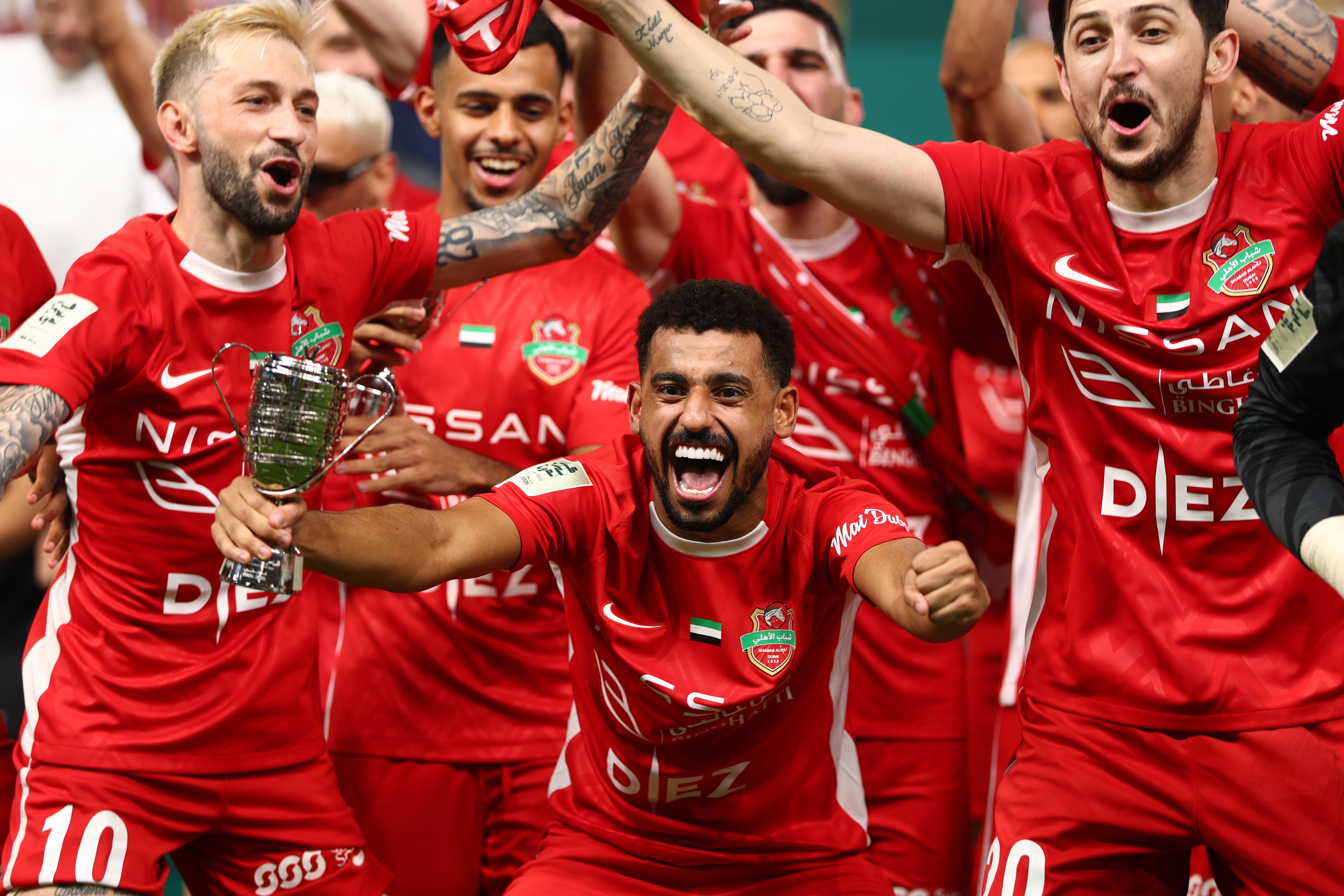 Players of Shabab Al Ahli celebrate after winning the Presidents Cup Final match against Sharjah FC during the Presidents Cup Final match between Sharjah FC and Shabab Al Ahli at Mohammed Bin Zayed Stadium on May 09, 2025 in Abu Dhabi, United Arab Emirates. (Photo by Francois Nel/Getty Images)