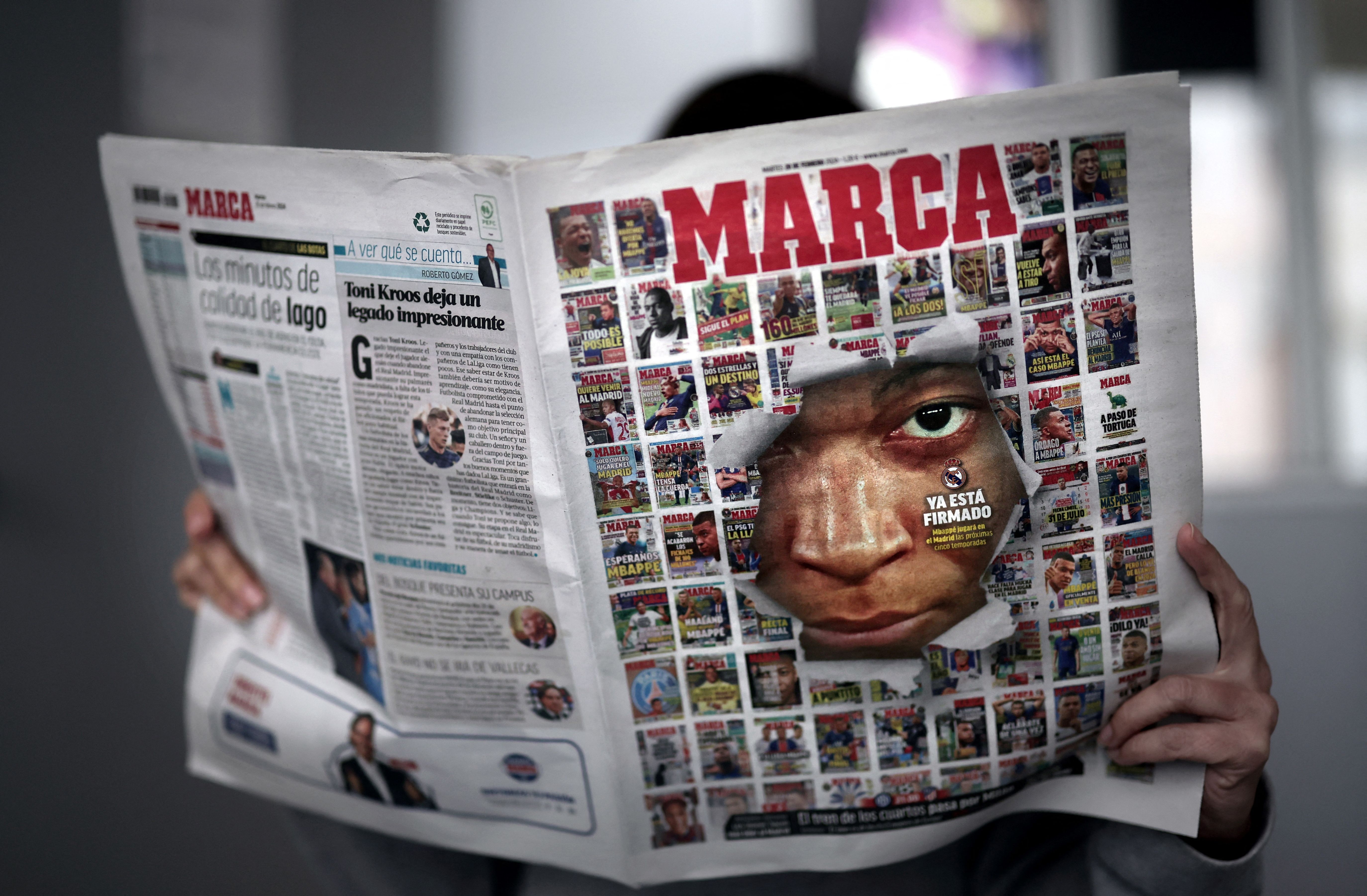 A picture taken in Madrid on February 20, 2024 shows a Spanish daily sport newspaper Marca's cover showing an image of Paris Saint-Germain's French forward Kylian Mbappe amid a combination of several Marca's covers. France captain Mbappe, 25, has told the French side he will leave at the end of the season, a source close to PSG told AFP on February 17. Superstar striker Mbappe is heavily linked with Madrid, who have tried to sign him multiple times in the past few years and may finally get their man. (Photo by Thomas Coex/AFP Photo)