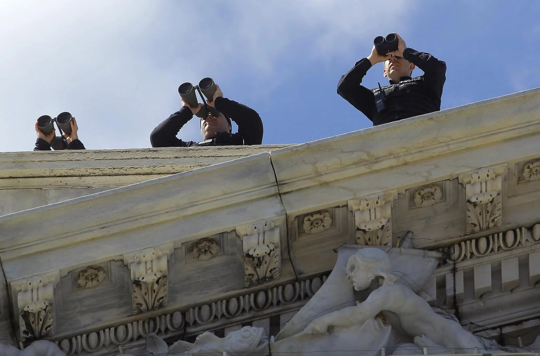 Security personnel atop the U.S. Capitol scan the area with their binoculars before U.S. President Barack Obama and Irish Prime Minister Enda Kenny walk down the east steps after attending the Friends of Ireland luncheon in Washington March 19, 2013. (Photo by Gary Cameron/Reuters)