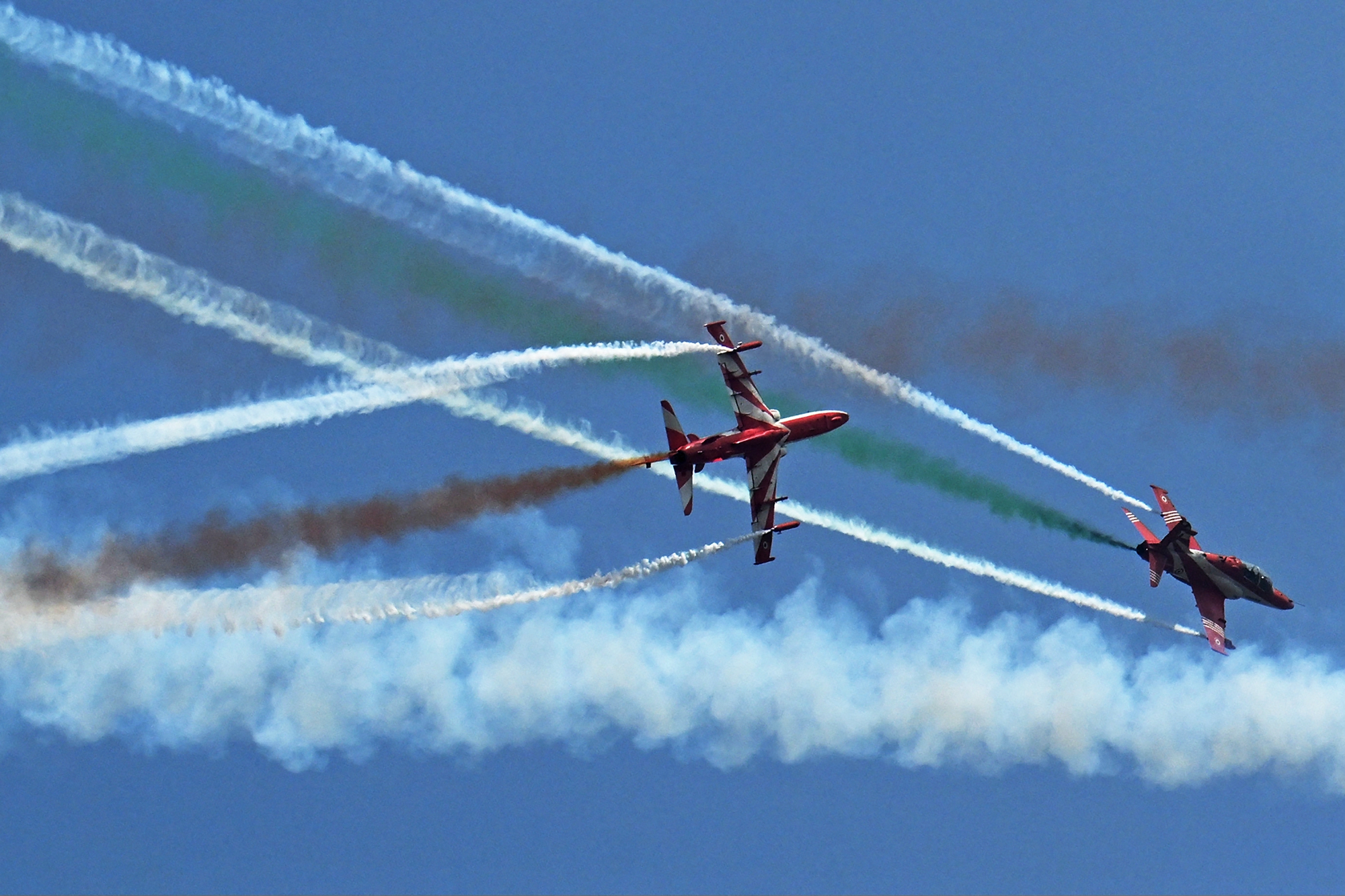 The Indian Air Force (IAF) Surya Kiran aerobatics team performs during the inaugural day of the 15th edition of 'Aero India 2025', a military aviation exhibition at the Yelahanka Air Force Station in Bengaluru on February 10, 2025. (Photo by Idrees Mohammed/AFP Photo)