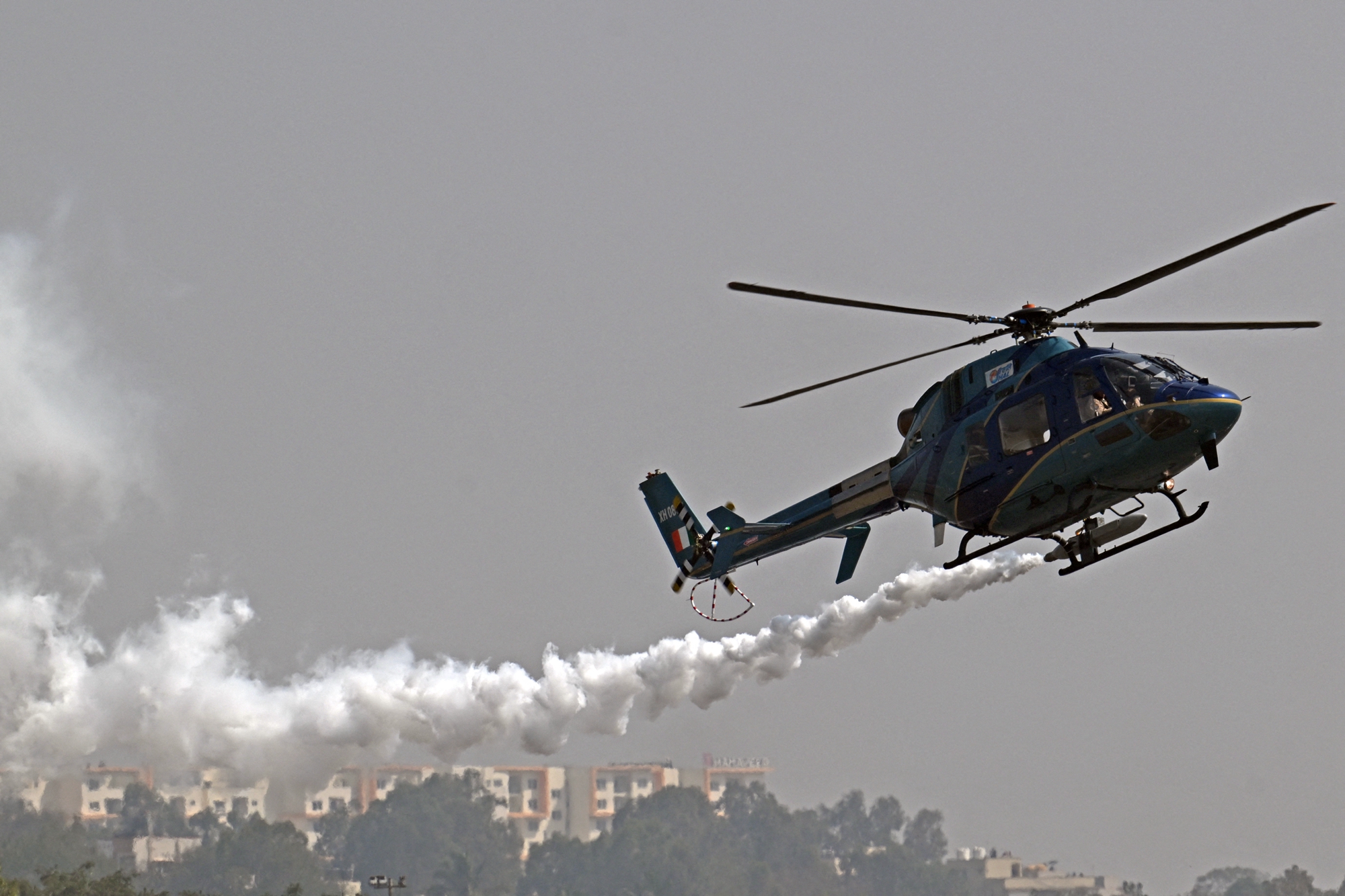 The Indian Air Force (IAF) HAL light utility helicopter performs during the inaugural day of the 15th edition of 'Aero India 2025', a military aviation exhibition at the Yelahanka Air Force Station in Bengaluru on February 10, 2025. (Photo by Idrees Mohammed/AFP Photo)