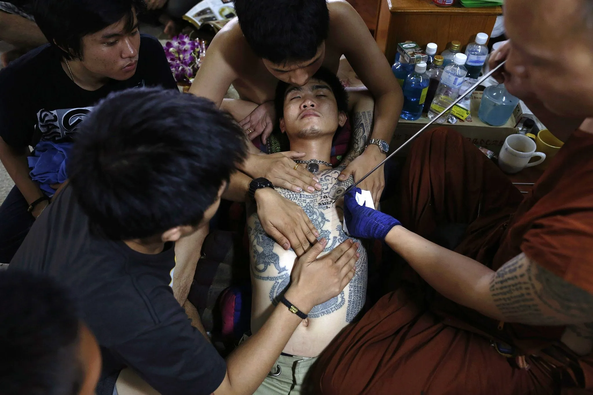 A Buddhist monk uses a traditional needle to tattoo the chest of Salut at Wat Bang Phra in Nakhon Pathom province, about 80 km (50 miles) from Bangkok March 21, 2013. Salut, a 26 year old from Bangkok's Klong Thoey slum who had his first tattoo at age of 17, believes tattoos protect him from danger and give him self confidence. Believers from across Thailand travel to the monastery to have their bodies adorned with tattoos and to pay their respects to the temple's master tattooist. They believe the tattoos have mystical powers, ward off bad luck and protect them from harm. (Photo by Damir Sagolj/Reuters)