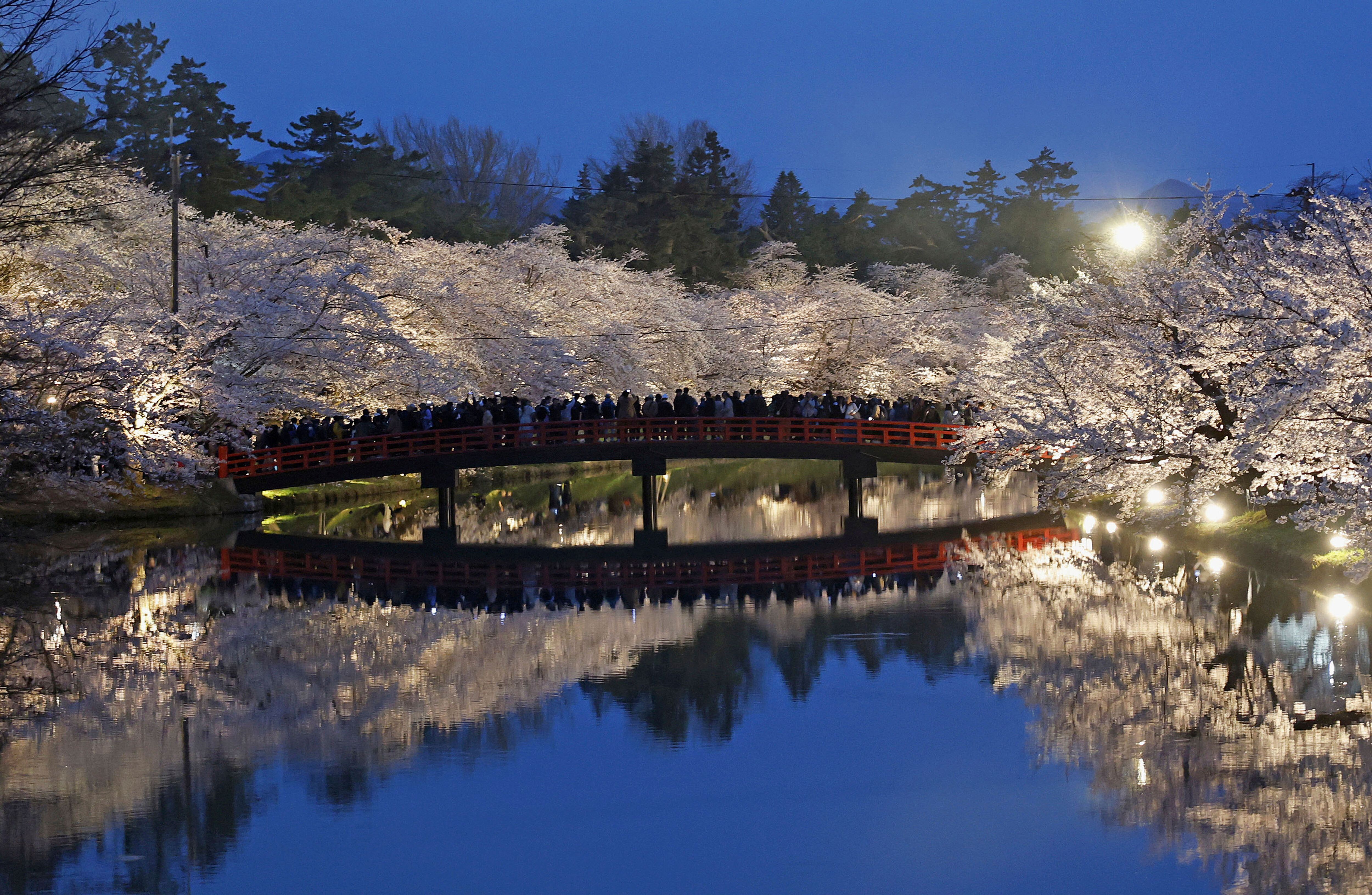 Cherry blossoms in full bloom are lit up at Hirosaki Park in Hirosaki City, Aomori Prefecture on April 21, 2025. Hirosaki Park is one of the most famous cherry blossom viewing spots in Japan, with around 1,700 Somei-Yoshino cherry trees in full bloom. There are around 2,600 cherry trees of 52 varieties planted in the park. (Phoot by The Yomiuri Shimbun via AP Images)